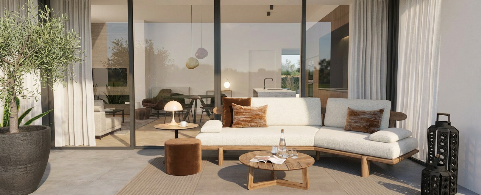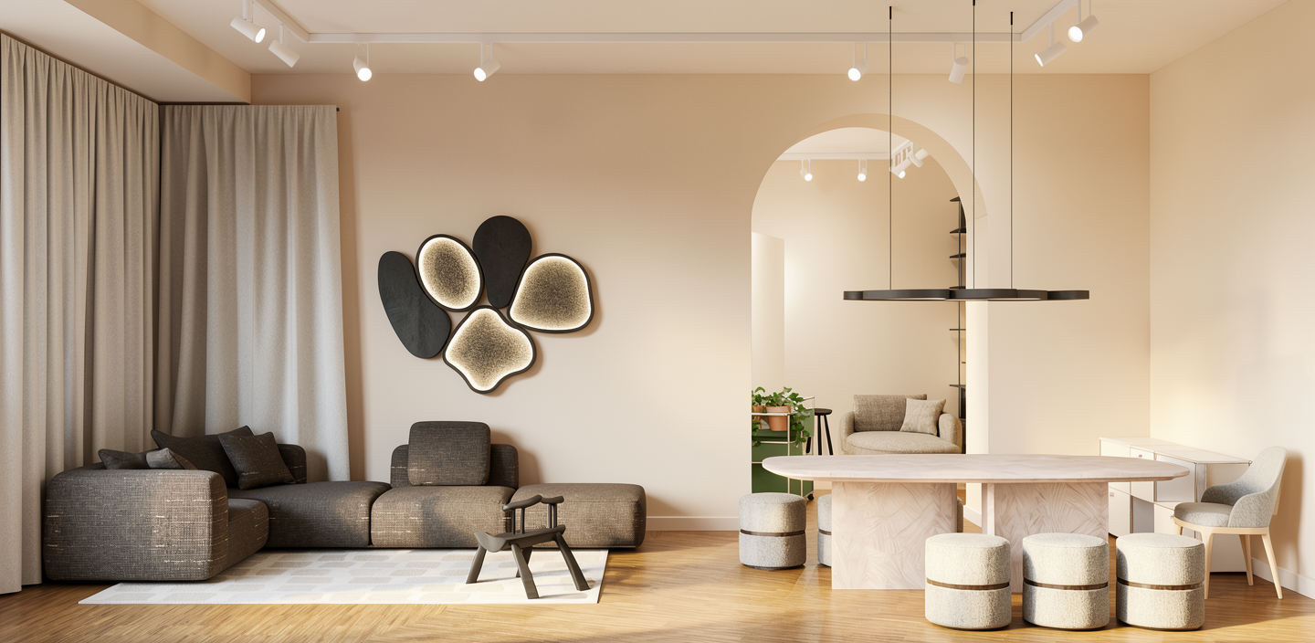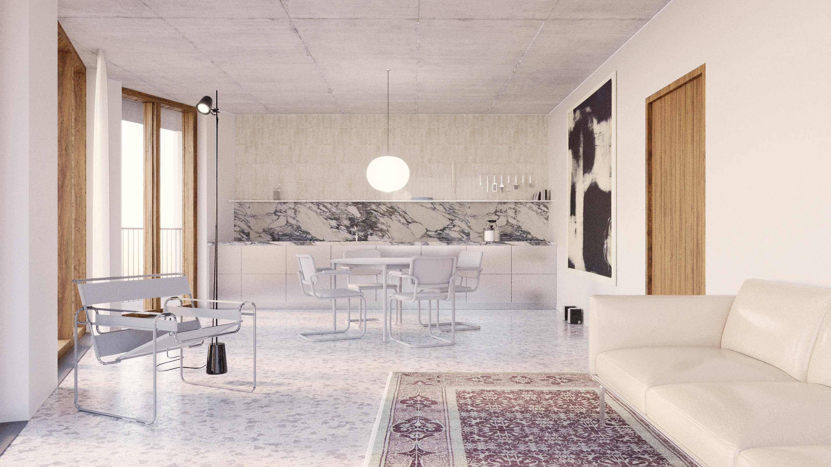 exterior shot preserve camera composition lighting and all geometry exactly do not change layout scale proportions light direction white balance or intensity keep original tone exposure shadows and highlights exactly do not relight the scene strict material transfer from references armchair wassily keep exact geometry material from reference 1 furry chair dense natural black and white cowhide fur clearly visible individual hairs slightly uneven hair length soft fluffy tactile surface visible hair clumping and natural direction variation noticeable thickness and depth not trimmed not flat not leather like pattern from reference 2 detail reference only larger black patches clean bold black shapes less fragmented spotting balanced black white contrast avoid small speckled pattern chrome frame highly polished tubular steel sharp realistic reflections black leather armrest straps dining chairs thonet s64 jil sander keep geometry exactly apply deep burgundy leather from reference smooth slightly glossy leather rich dark red tone soft highlights subtle reflections realistic chrome tubular frame dining table keep geometry exactly natural wood tabletop visible grain warm brown tone matte finish brushed satin metal legs important combine fur material from reference 1 with pattern distribution from reference 2 materials must match references precisely no reinterpretation no redesign do not add duplicate or remove any furniture keep exact number of objects in the scene lighting is fixed from the original image and must not be influenced by references ignore lighting from moodboard images completely use only original scene lighting