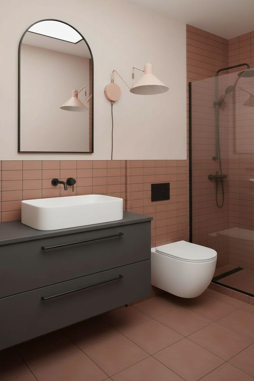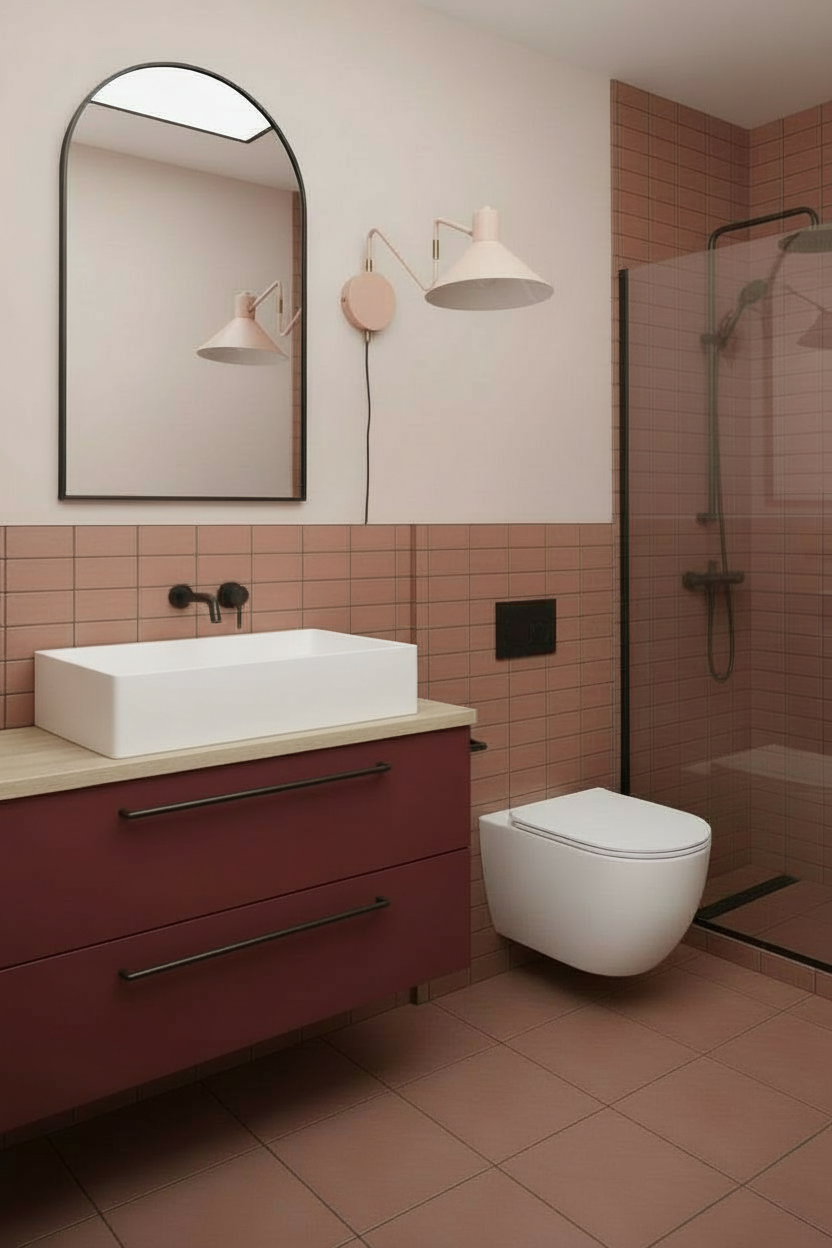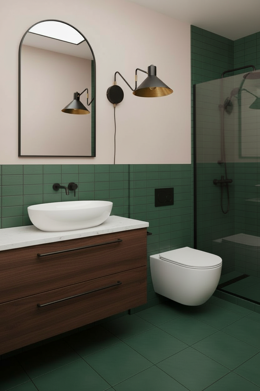 transform the provided design software drawing into a highly photorealistic kitchen rendering maintain the exact layout proportions and cabinetry locations from the original design file the kitchen features flat panel lower cabinets in a muted sophisticated green with a matte or soft satin finish upper cabinets are flat panel medium to light oak with visible natural wood grain and a warm tone the countertops and backsplash are taj mahal quartzite featuring soft beige cream and subtle veining the quartzite continues as a waterfall edge on one side of the peninsula and wraps down the back of the peninsula a custom gold metal range hood is centered above the cooktop with a refined brushed or satin finish use realistic materials accurate reflections natural wood texture and true to life stone veining lighting should be soft and natural as if daylight is entering from nearby windows with gentle ambient and task lighting to enhance realism render at high resolution with professional interior photography quality realistic shadows depth and perspective do not add handles at the back that is just a flat back