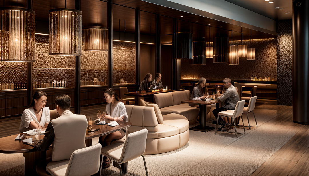 ultra realistic restaurant interior render same camera angle warm 2700k lighting filling all ceiling coves above the bar mirrored yellow glass ceiling tiles with subtle reflective highlights front mosaic seafood display with crushed ice fresh fish and shellfish bar with amber ribbed glass panels and premium alcohol bottles on warm backlit shelves rosewood palisander columns with vertical brushed bronze inlays and bronze base velvet orange banquettes tan leather chairs yellow window curtains with bright cove lighting above high detail materials crisp reflections photorealistic textures