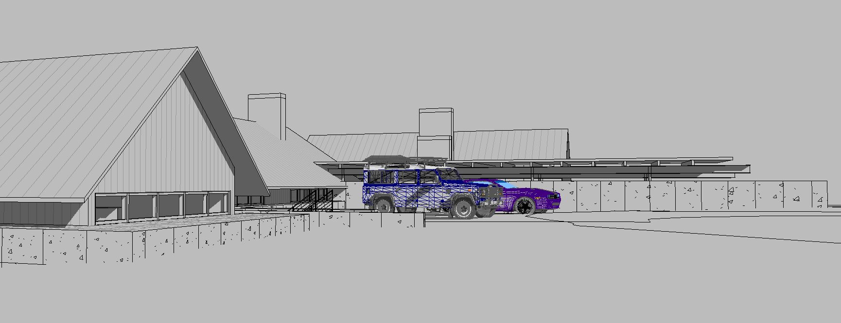 rustic shiplap siding with corten panels concrete accent walls matte black car tall grass in foreground trees in background sunlight on building face dusk fog interior lights