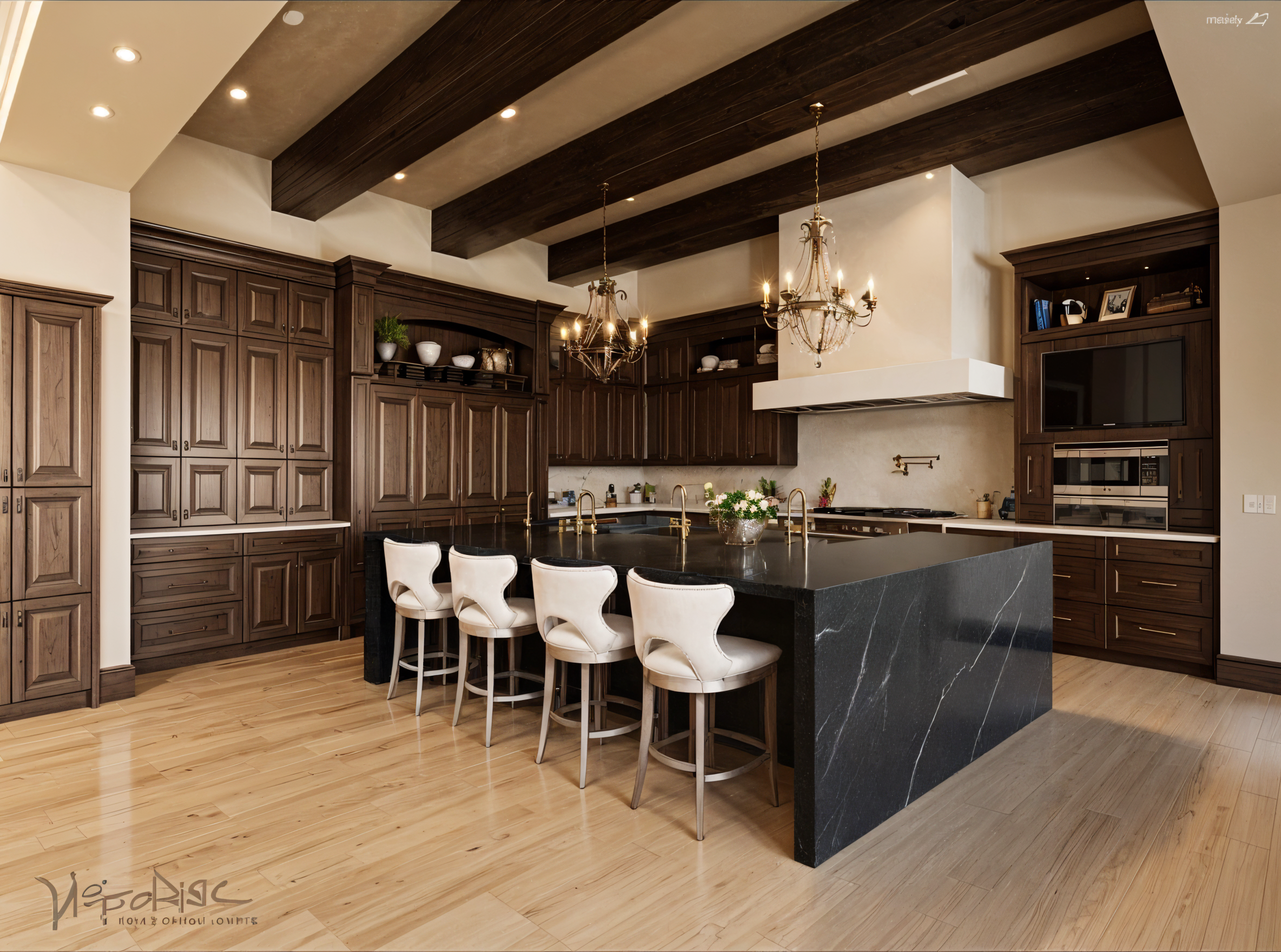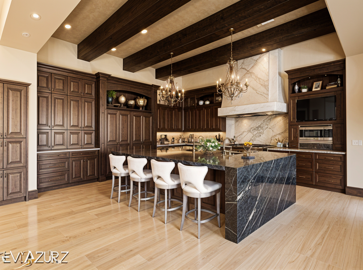 design a striking high end kitchen featuring a wow factor waterfall edge island made of dark natural stone with beautiful veining reflecting a super modern luxury aesthetic include a modern hood vent that has light cream beige natural stone cover with no architectural ornate details with the same stone added to the backsplash give me another hood design with modern elements that is straight edge profiles
