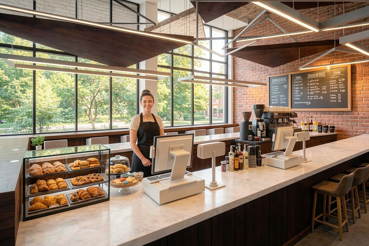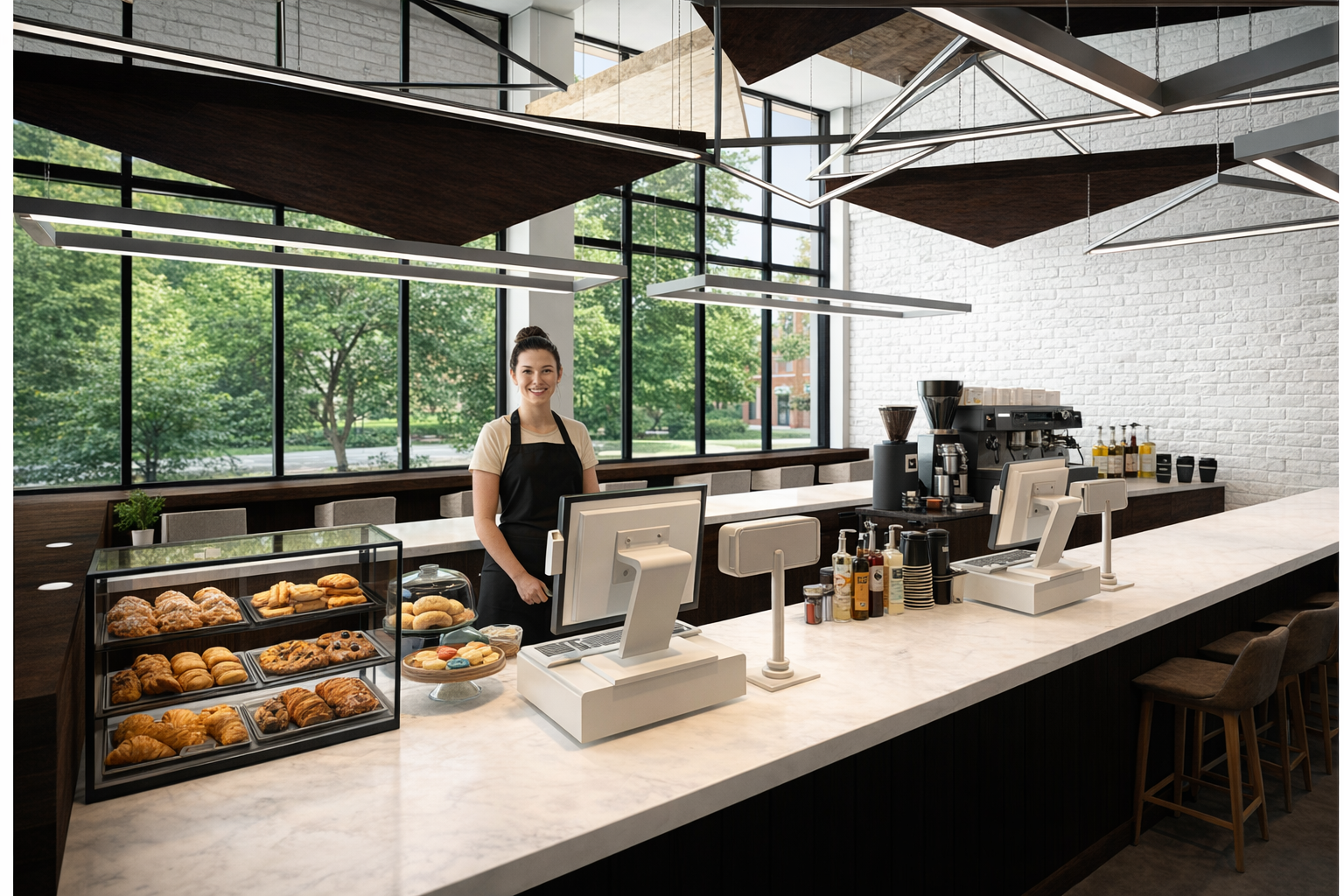 dont change any materials add a menu board to the brick wall and make the wood triangles look like brown and gery acoutics