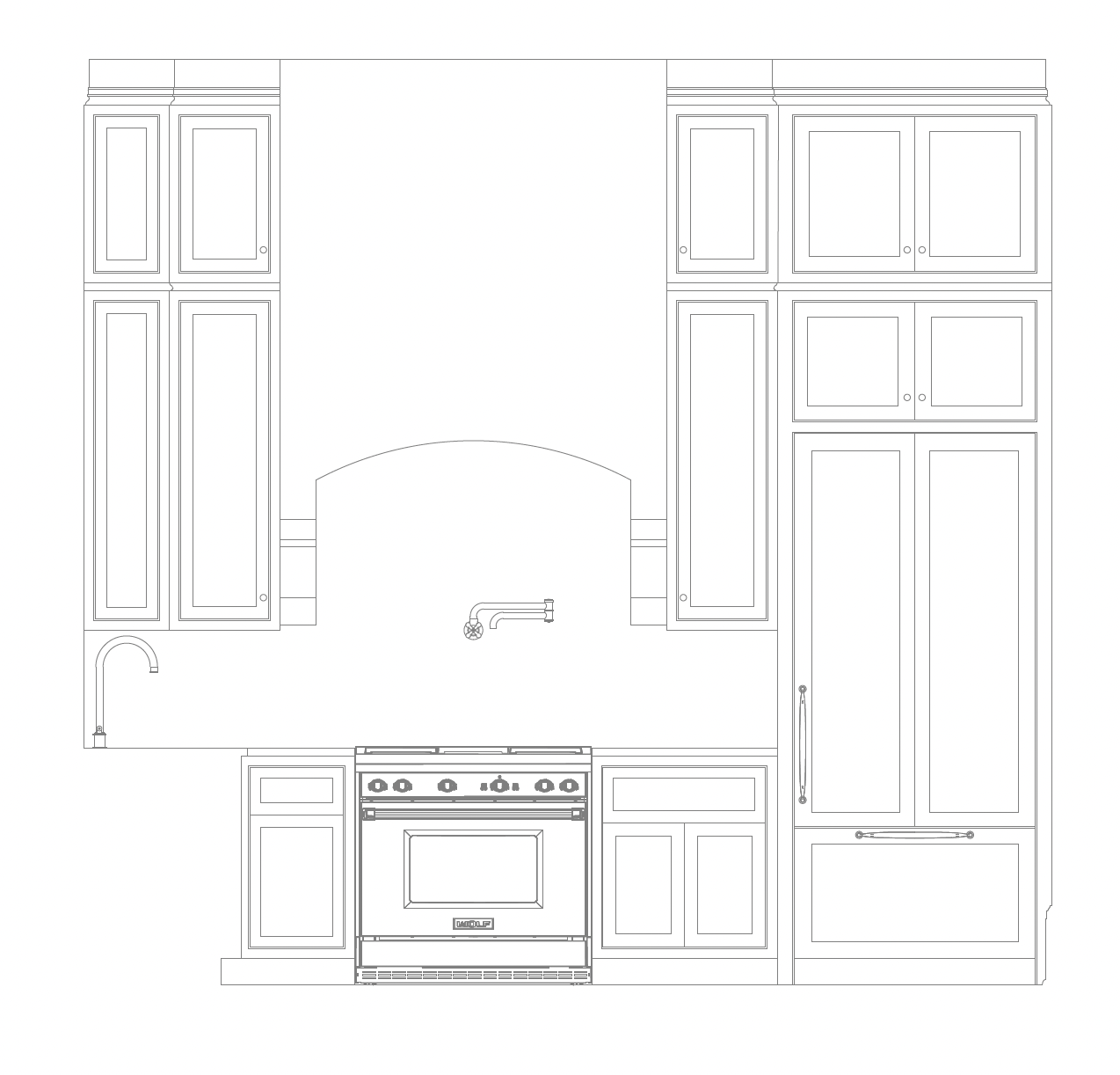cream cabinets with plaster range hood and marble counters and wall splash up to arch