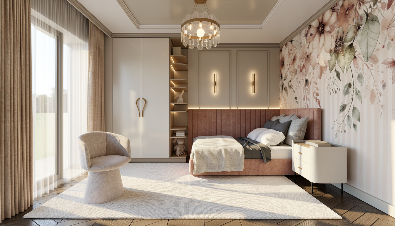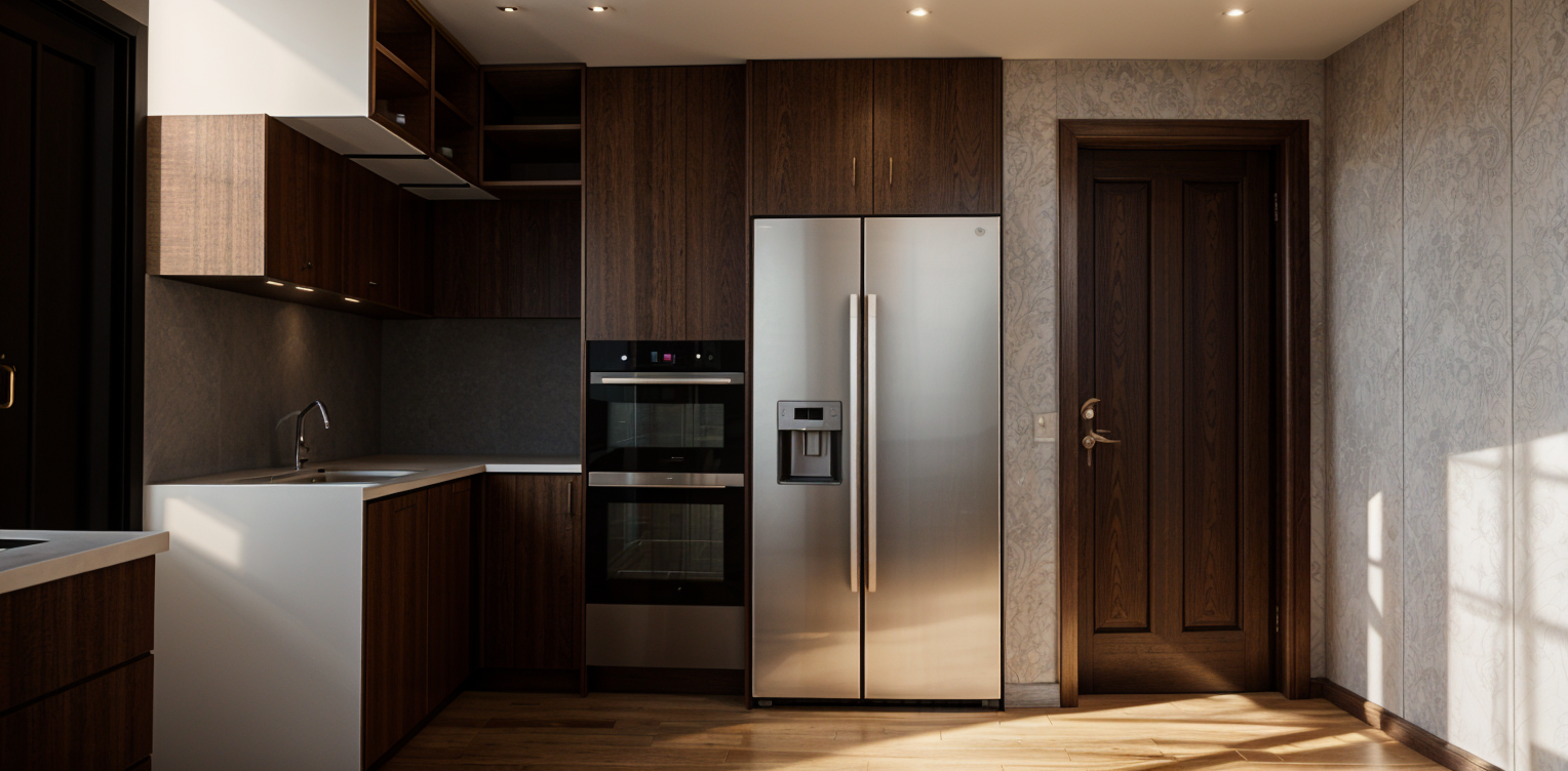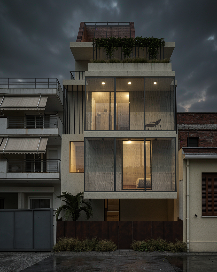 its golden hour and shadows have formed inside on the floor and there is a slightly pink tone in the sky the house has neighbours on both sides which look exactly the same