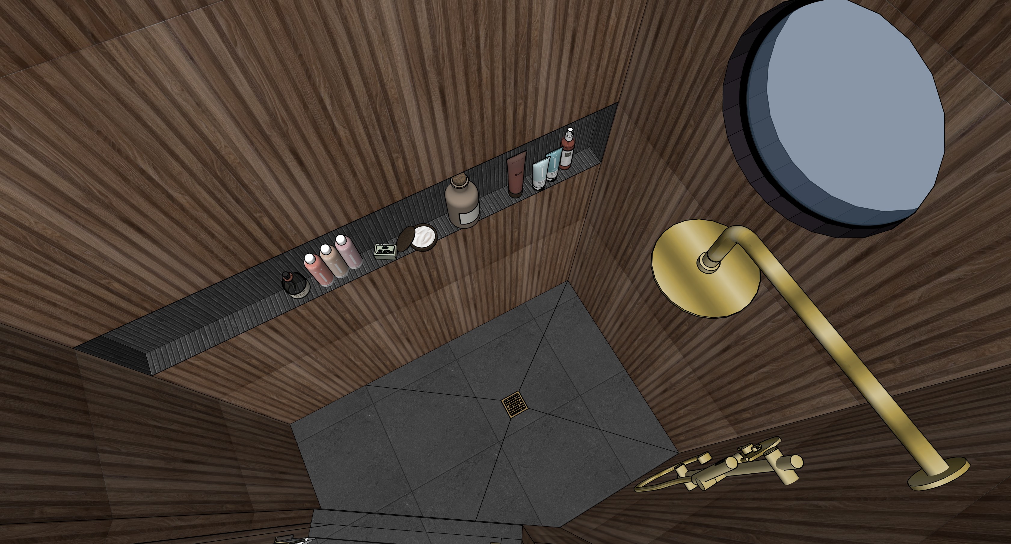 a modern bathroom with green tiled shower walls white marbled gray floor tiles brass fixtures and a round blue tinted window add white towels hanging on an antique brass hook capture a serene spa like atmosphere with natural light softly illuminating the space