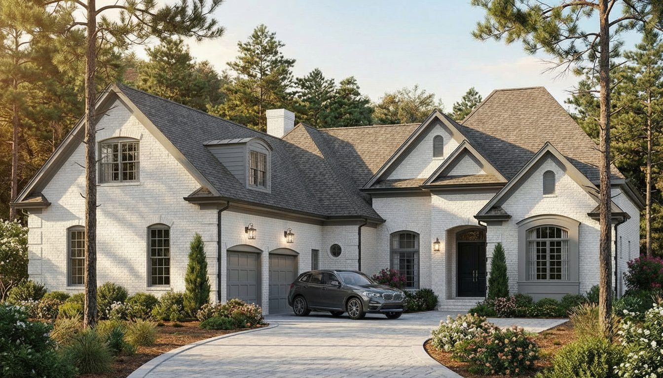 add chimney pot on chimney larger lights above garage doors larger light at front door white brick