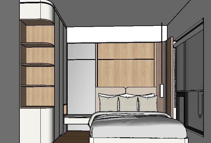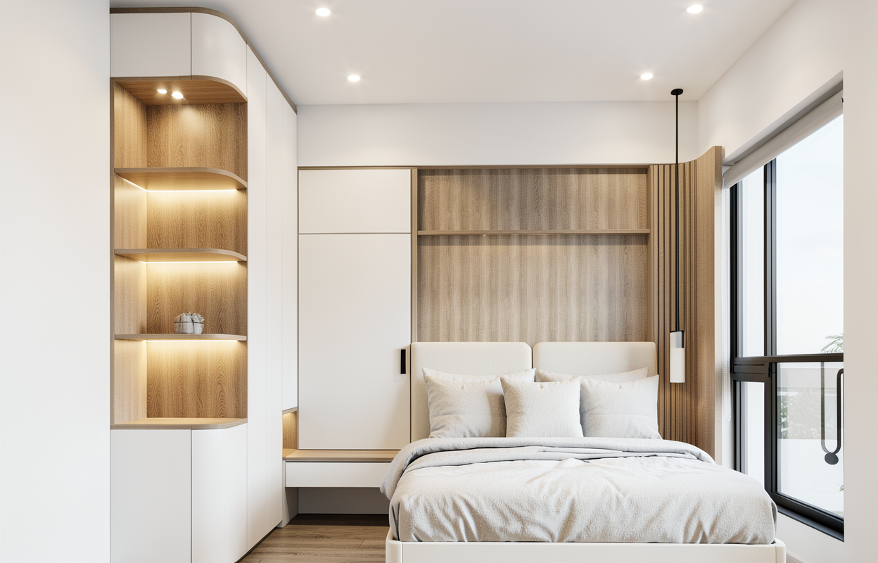 buat gambar ultra realistis tanpa mengubah struktur bentuk desain atau material apa pun jangan mengubah ukuran jpeg dinding warna off white dan plafond warna putih tambah lampu spot light di plafond dan tambah indirect light di setiap rak ambalan dan jangan ubah material warna dan bentuk