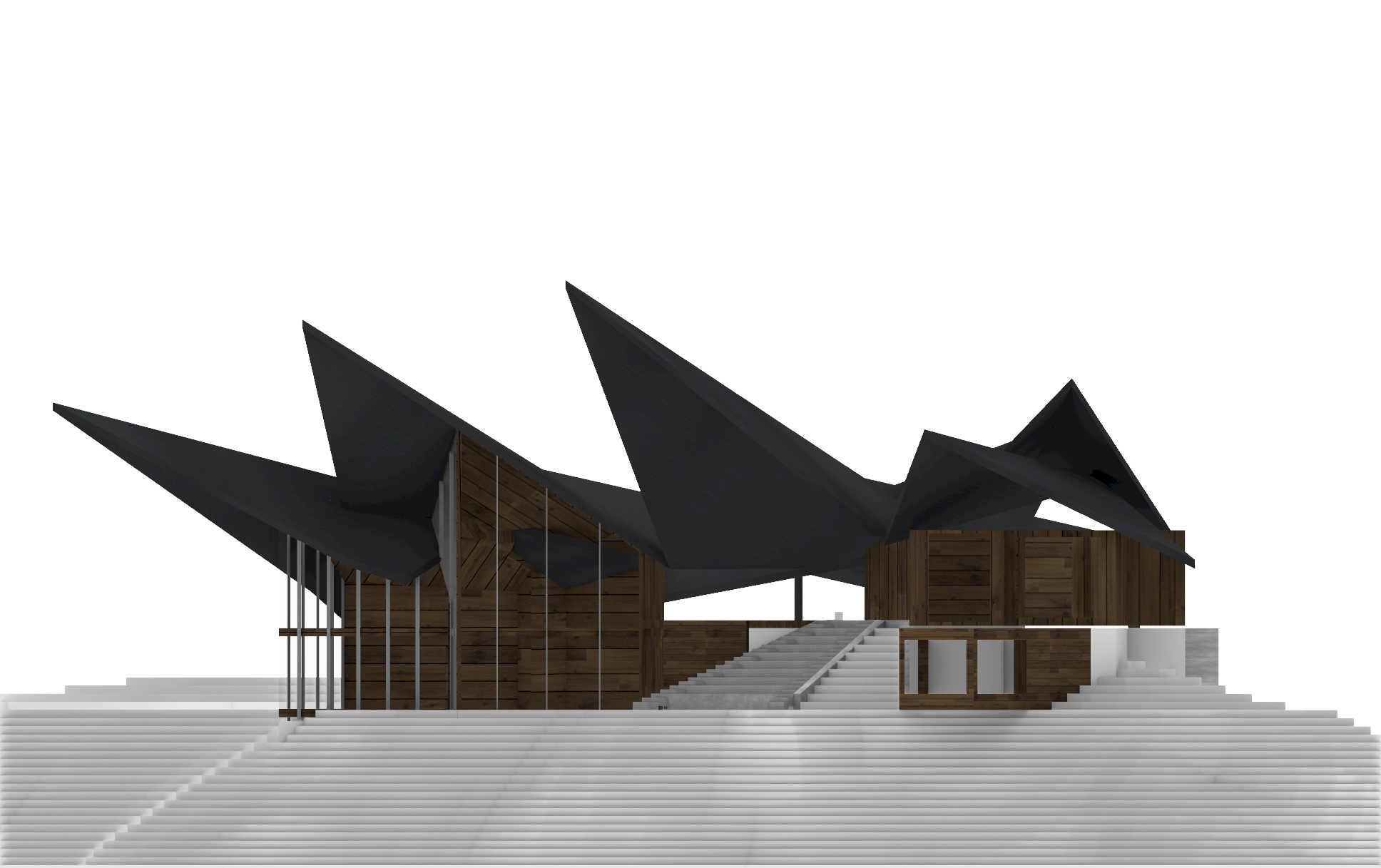 render this building with realistic materials but put it in the style of pastel watercolor make the background in a mountain