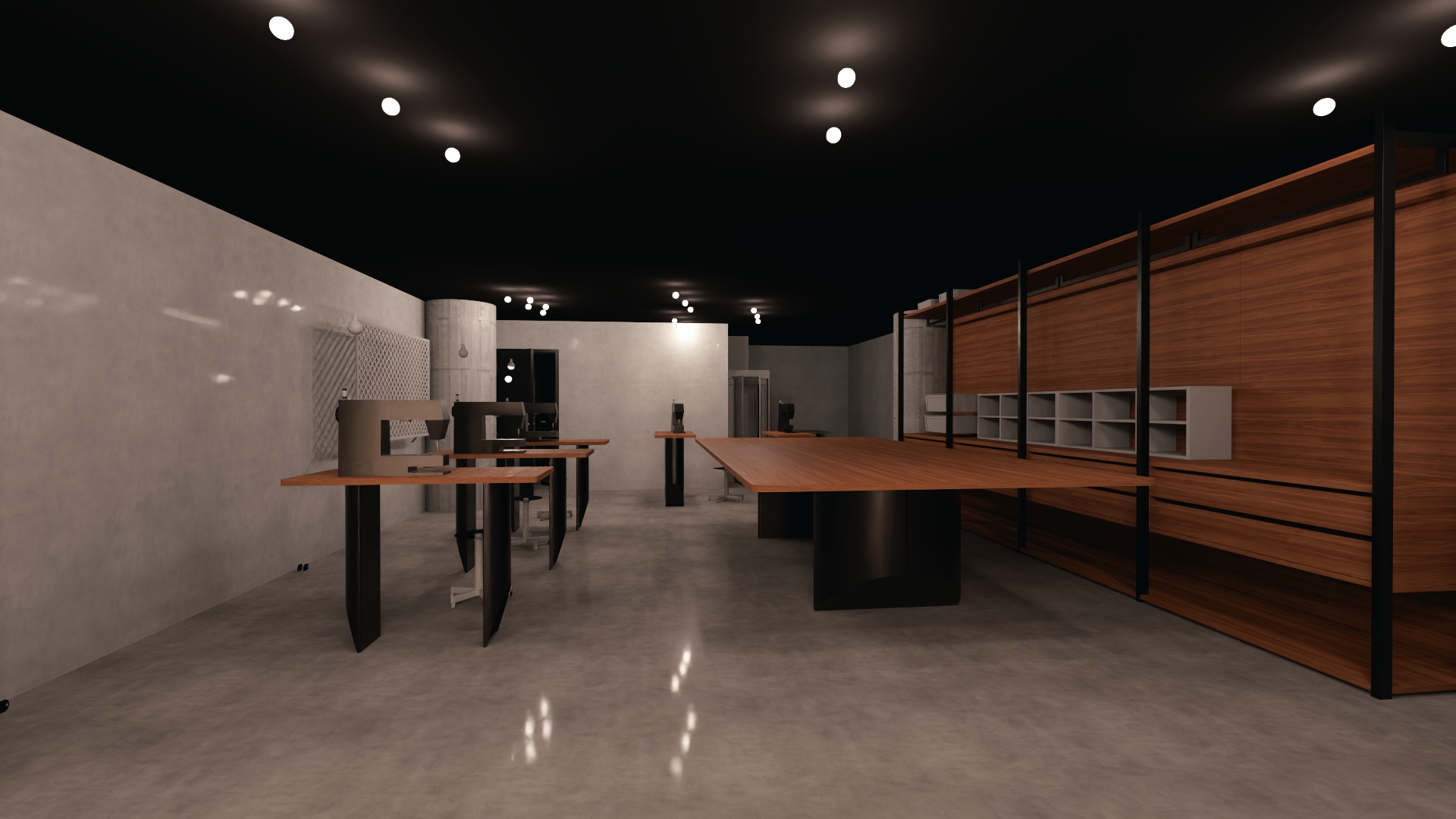 seamstress workshop grey floor concrete walls and columns black framed glass doors light up interior add floor lamps with cloth white shades all tech nical lights change to erco light up
