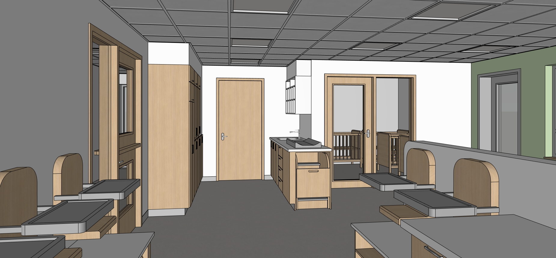 photorealistic architectural interior render of a childcare center cpe based strictly on the provided sketchup image do not add remove or modify any architectural elements furniture openings or layout keep all objects proportions and positions exactly as modeled all existing ceiling light fixtures must be turned on and emit soft realistic illumination combine artificial lighting with natural light if present keeping a balanced and believable exposure preserve the original colors and materials but enhance them with realistic textures accurate material properties and subtle imperfections wood grain fabric softness matte finishes child friendly clean calm and warm atmosphere suitable for a cpe environment realistic global illumination soft shadows correct scale neutral camera perspective no dramatic effects no stylization no artistic interpretation ultra realistic architectural visualization professional quality natural color grading no new furniture no extra decor no change in layout no change in wall positions no change in ceiling design no natural light from the doors glasses interior door all walls and ceiling must remain their orginal colors do not add new light fixture in the furniture all furniture must remain the same material as the original image