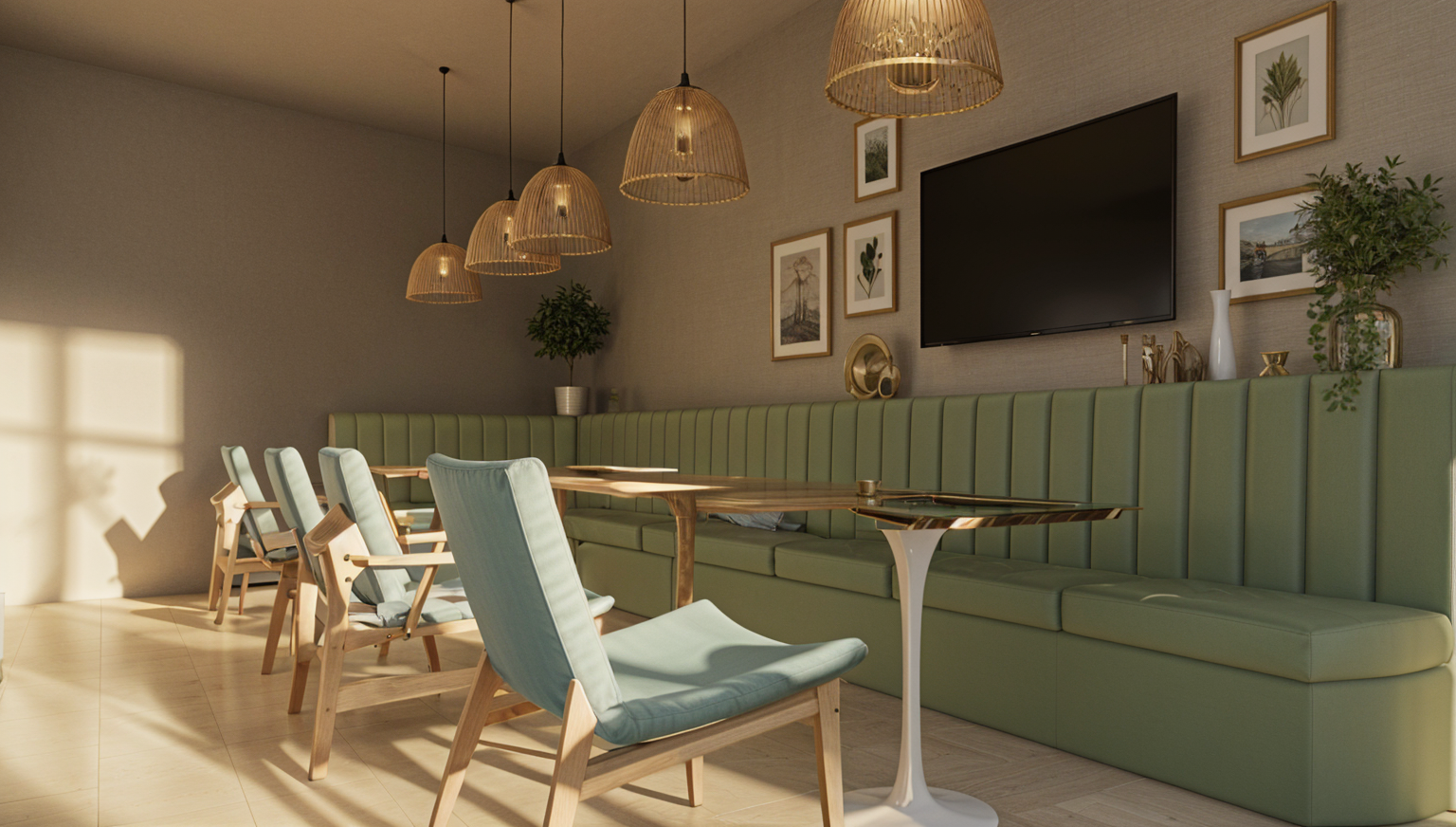zeleni kau sme e i zenlene stolice moderniji lusteri televizija na desni zid dekoracije i slike i biljke po zidovima na lijevi id takoder dekoraqcije stolovi crni i drveni dodaj biljke architecture
