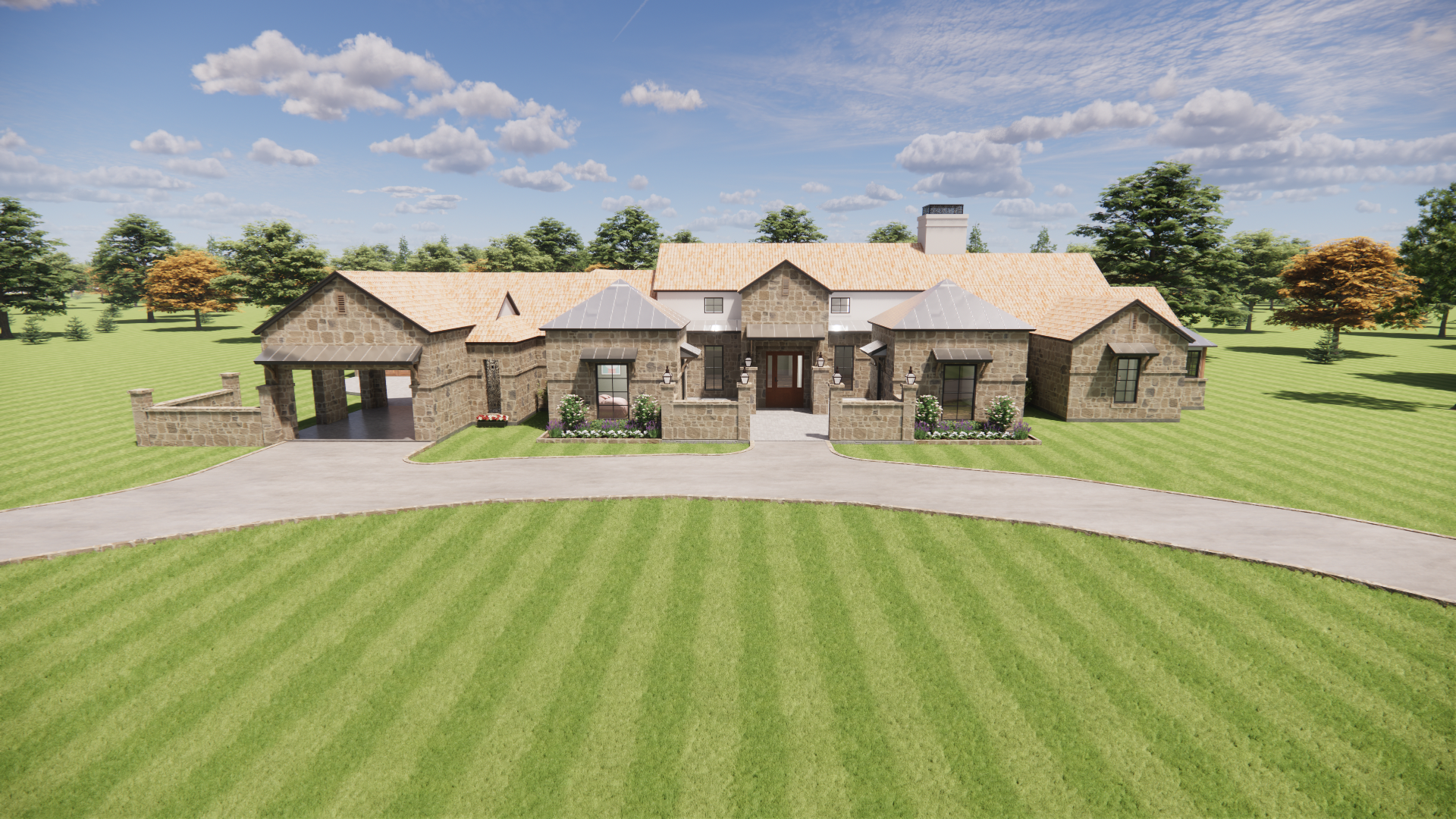 you are a professional image renderer you create the highest grade renderings around and specialize in architectural renderings this is the front elevation of a house create a high resolution photorealistic image of this structure keep the windows as they are where they are keep the doors as they are where they are keep the main structure as it is where it is feel free to change the perspective keep the roofline as it is where is it do not add anything to the structure that i have not asked for the roof is composition shingles architectural style it should be early afternoon with a bright sunny day clear skies the landscaping should be late summer with plenty of color and should be that of a luxury estate this is multi million dollar home in a very high end development think mar a lago add a fountain and other regal landscaping