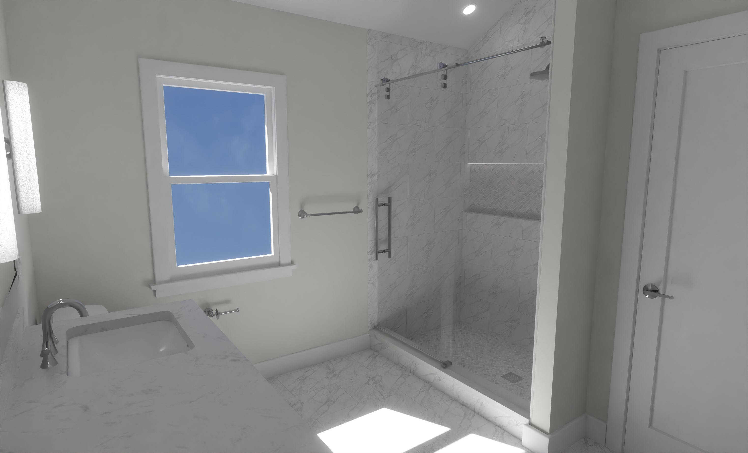 add realism to the image don t change color or textures vanity has 2 sinks high quality detail image white carrara countertop and curb cap glossy tiles on shower wall and bathroom floor size 12x24