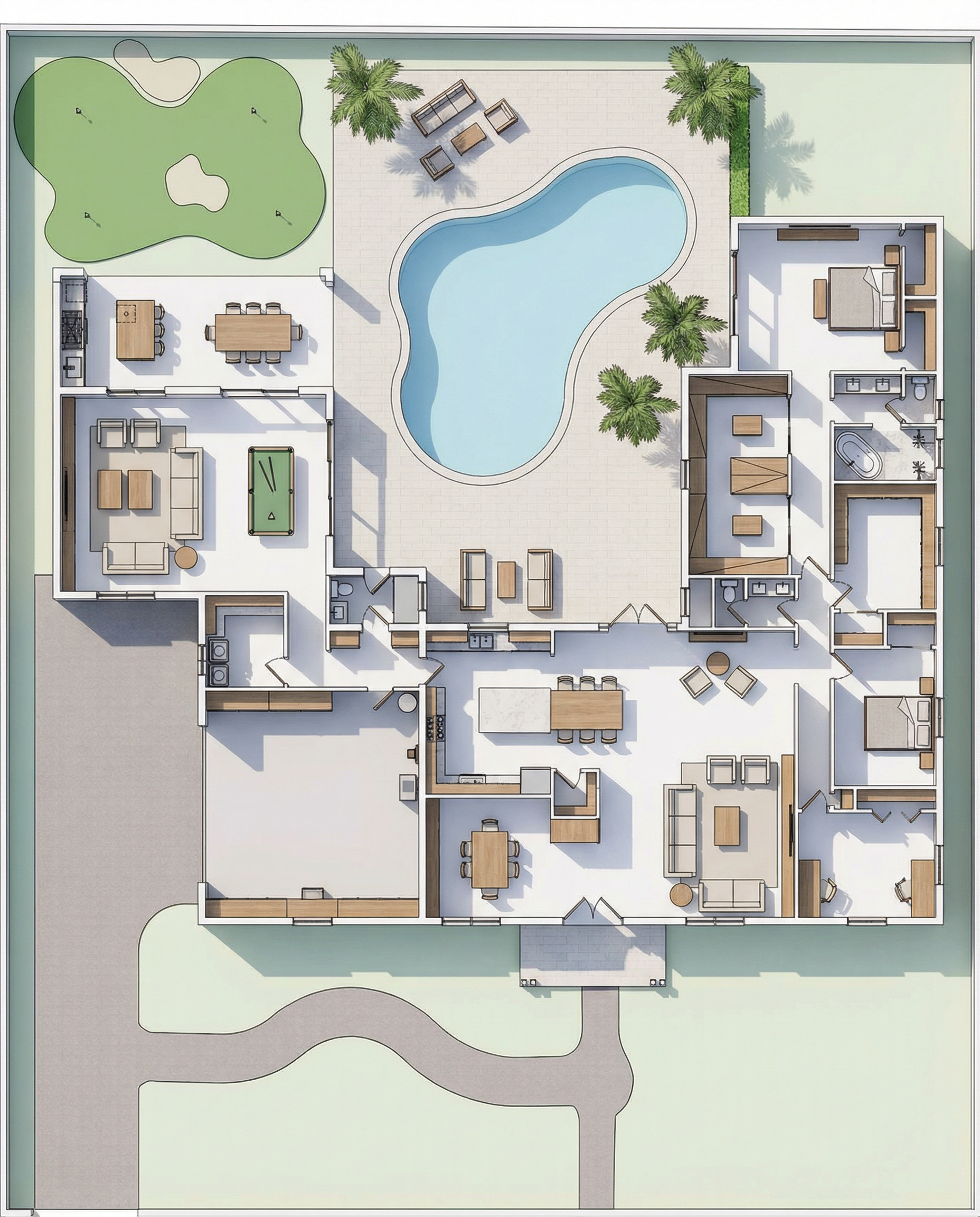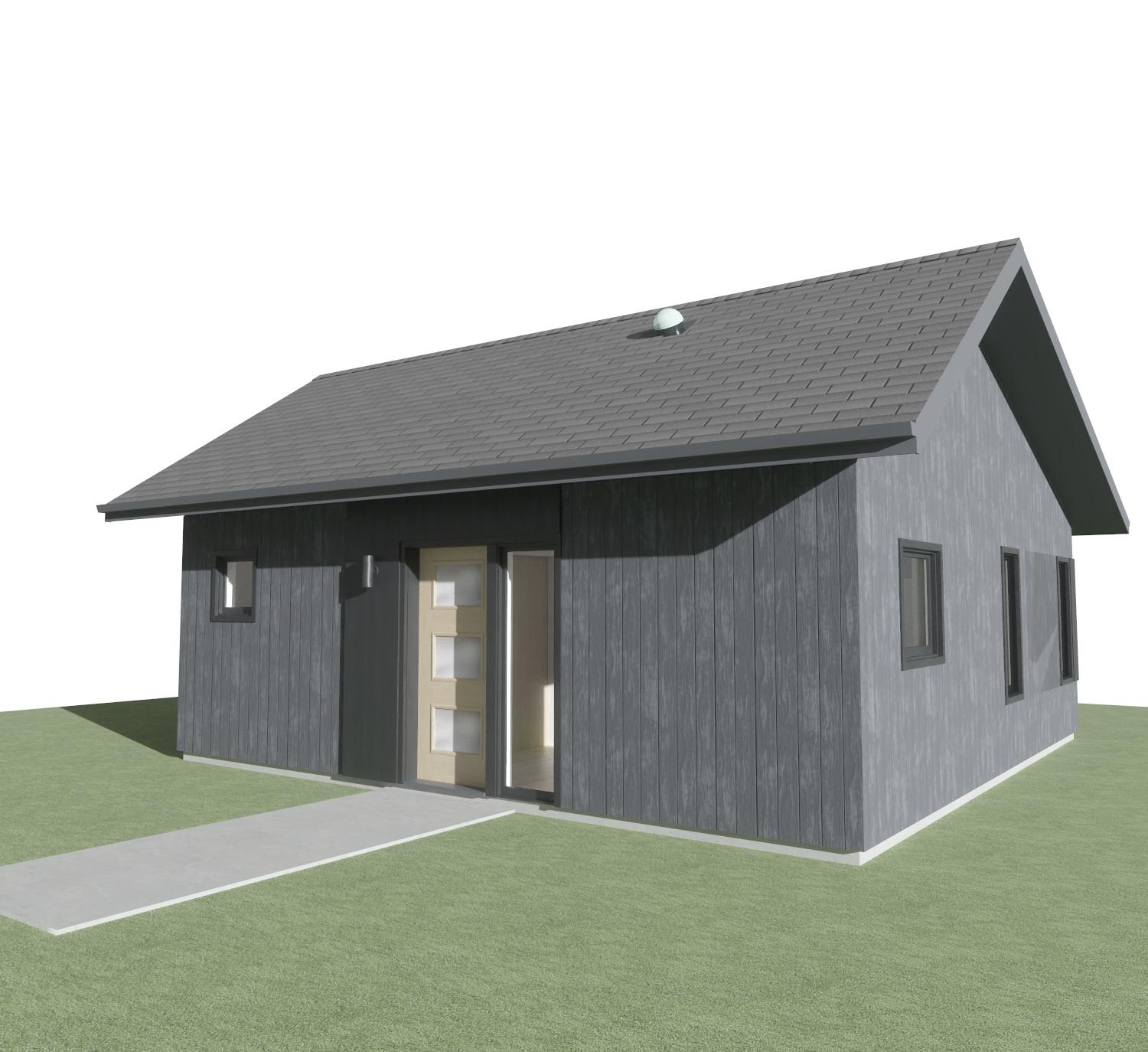black and white line drawing architectural elevation style clean lines shading white background with trees and cloud include shrubbery around house place a taller shrub on the blank area to the right of the front door