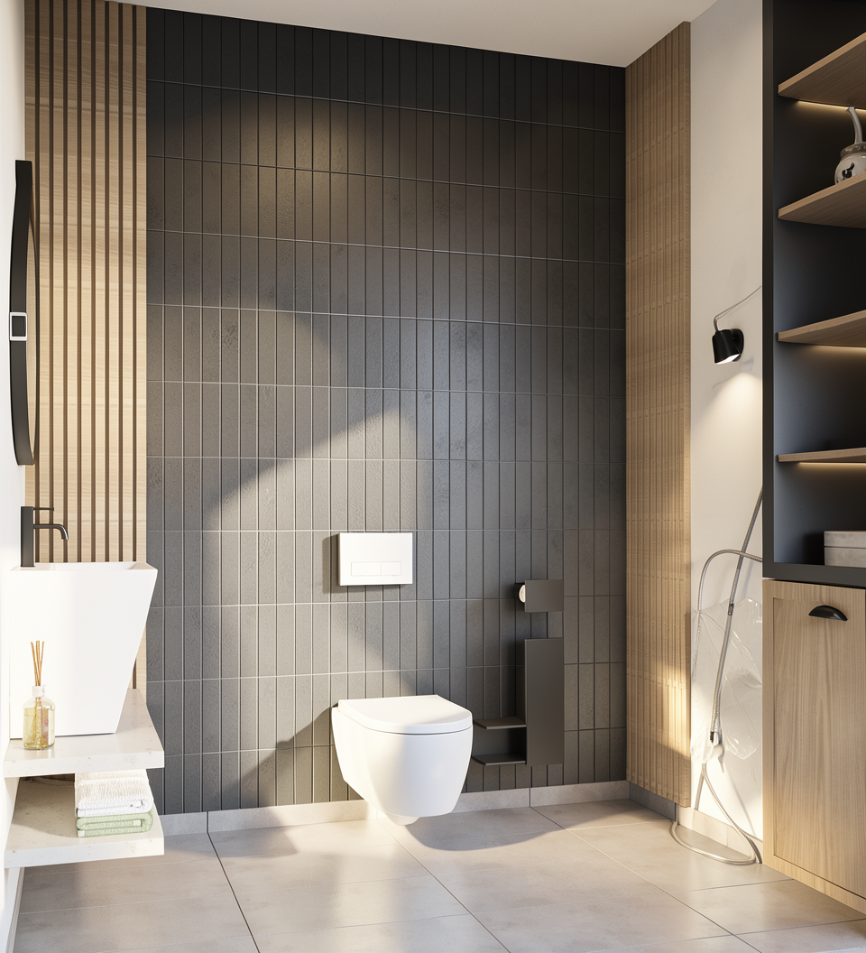 remove sunlight and make it a moody interior rendering do not change finishes do not change ceiling design do not change light fixtures or vanity design