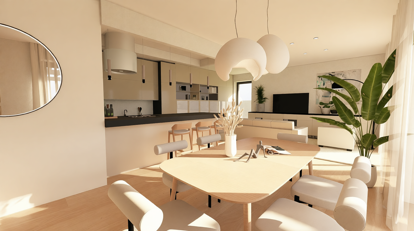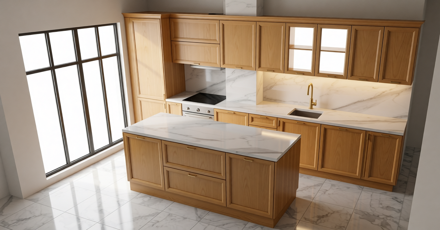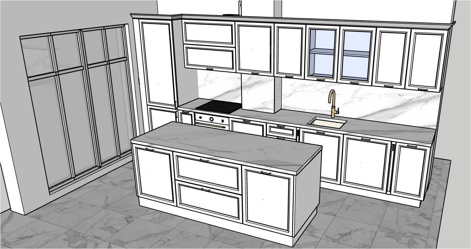 render it kitchen is white wood color put some acsessoies like red wine and glassess put glasses and plats in the cupboard with glass