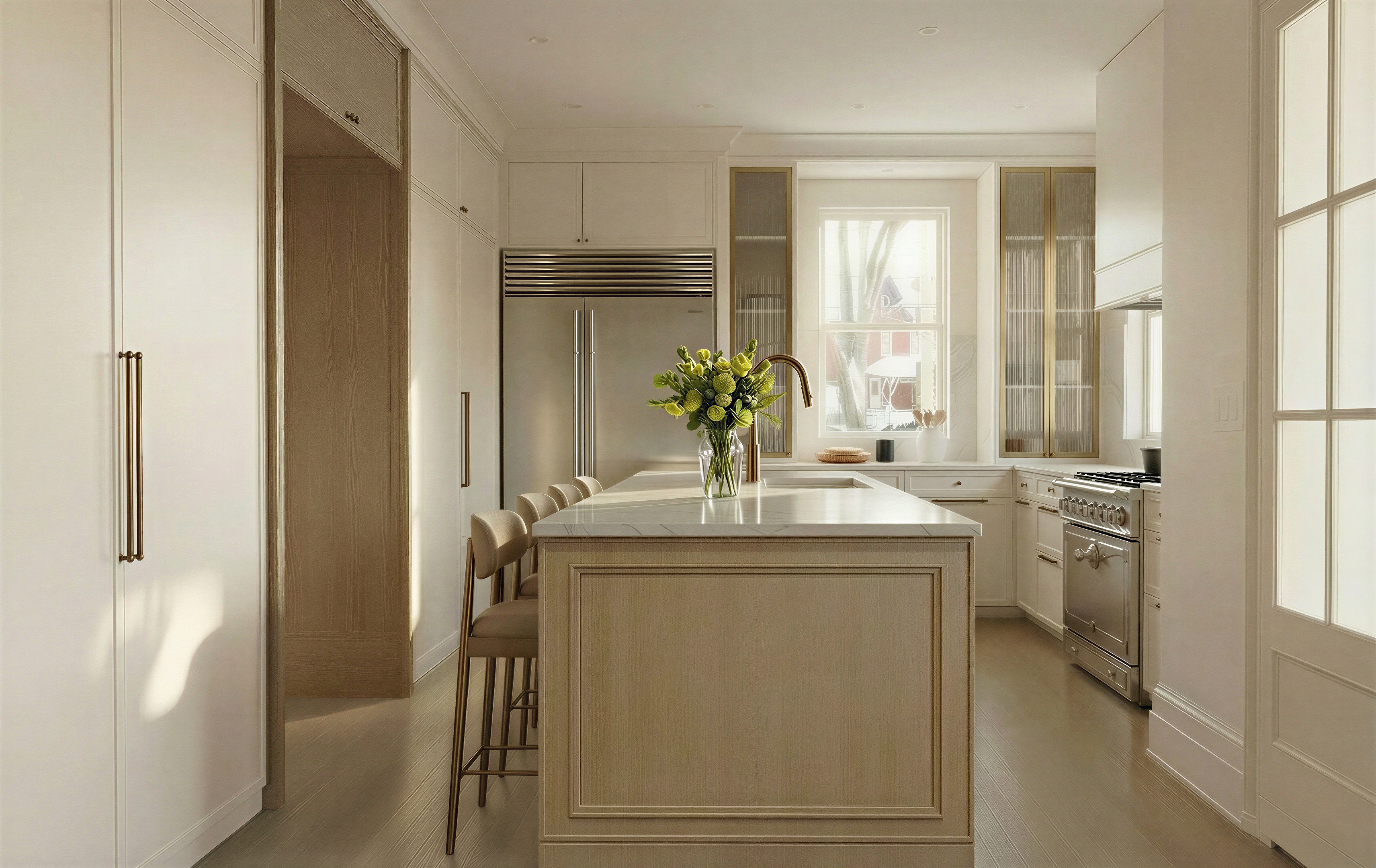 dont change anything just remove the brass finish for the top cabinets in the back and replace with the same white as the other cabinets dont change anything else
