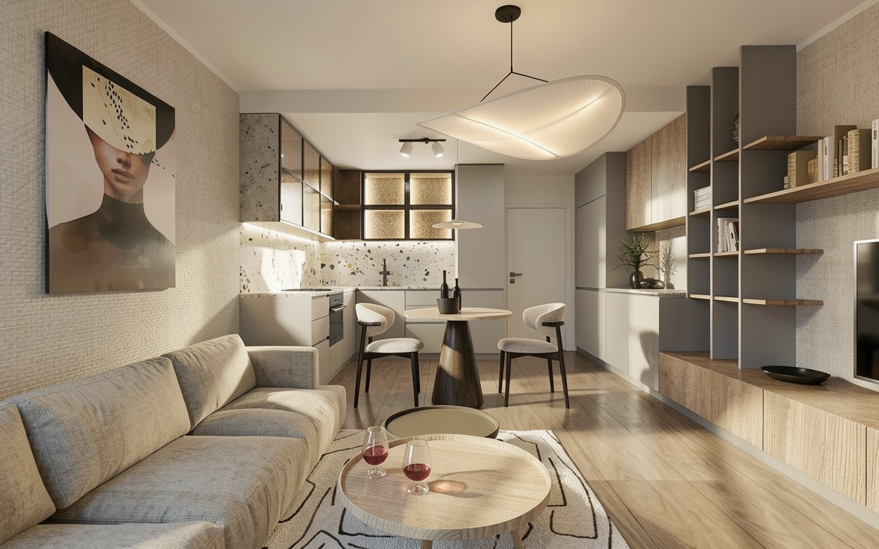 parquet a spina pochi oggetti nella libreria un vaso sul tavolino