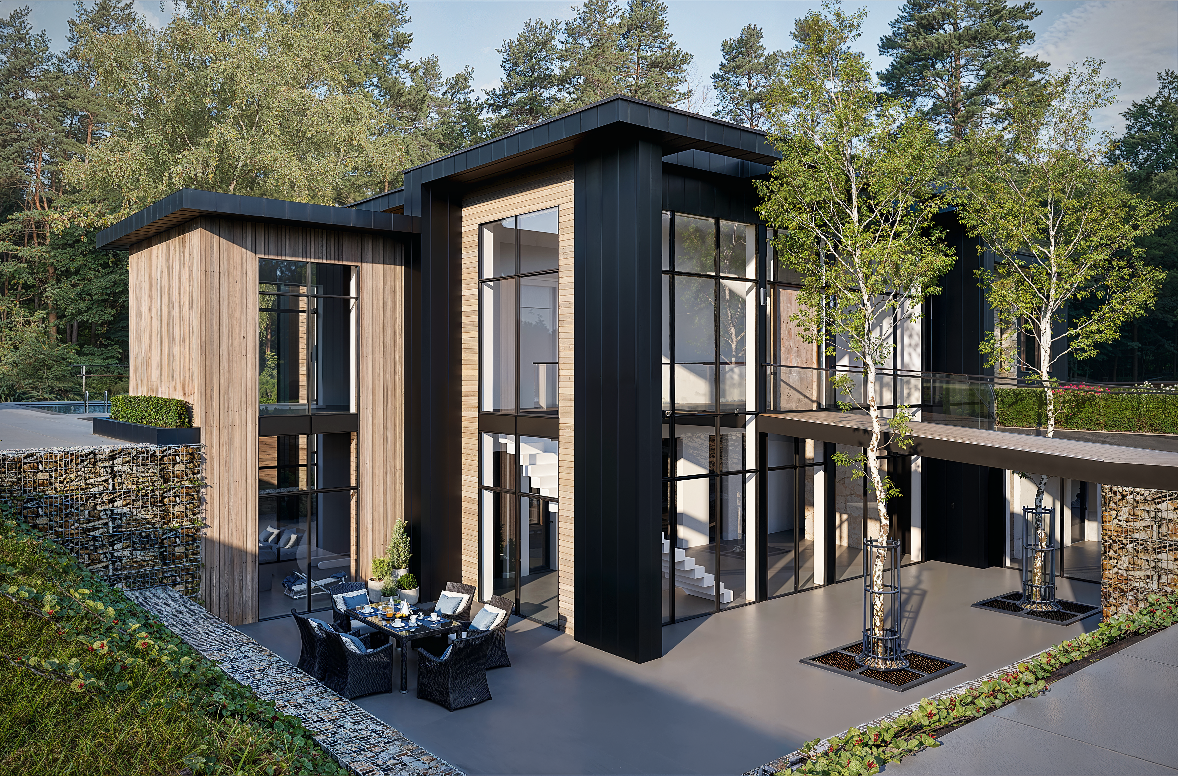 create a hyperrealistic visual of this elevation the cladding is black standing seam and the timber is ipe boarding with shadow gaps between timber pieces add soft landscaping and make the window frames black alminium