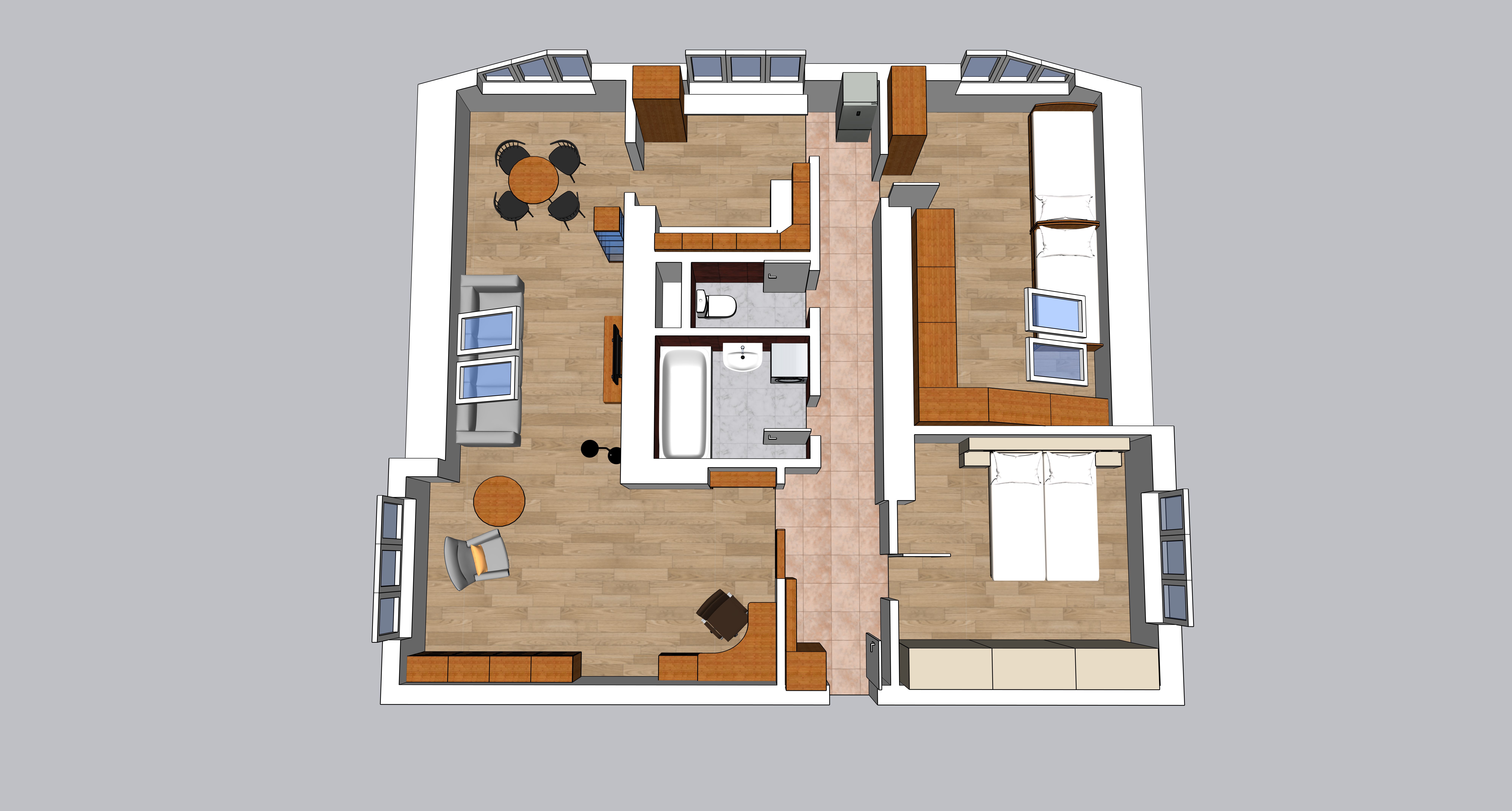 vykresli p dorys ze sketchupu v pln realistick m vyobrazen nastav m kk dnn sv tlo shora a m rn zleva a zep edu tak a je v e patrn st ny sp e kr tk a m kk vykresli n bytek v barv ko ak a podlahu v dez nu dub sklo v oknech vykresli jako namodral c lem je top real estate prezentation
