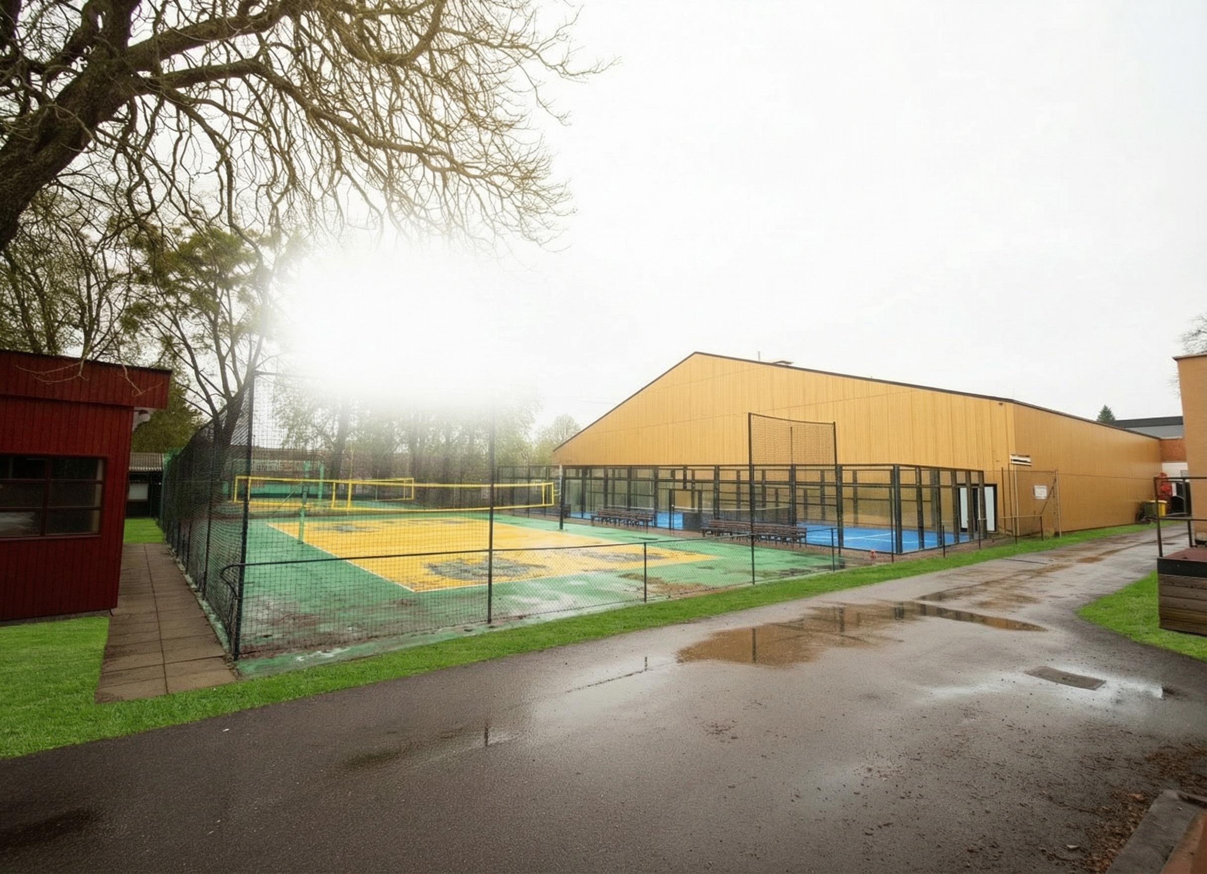 change grass stripe along road to sidewalk summer afternoon change two volleyball courts and two padel courts to references keep position