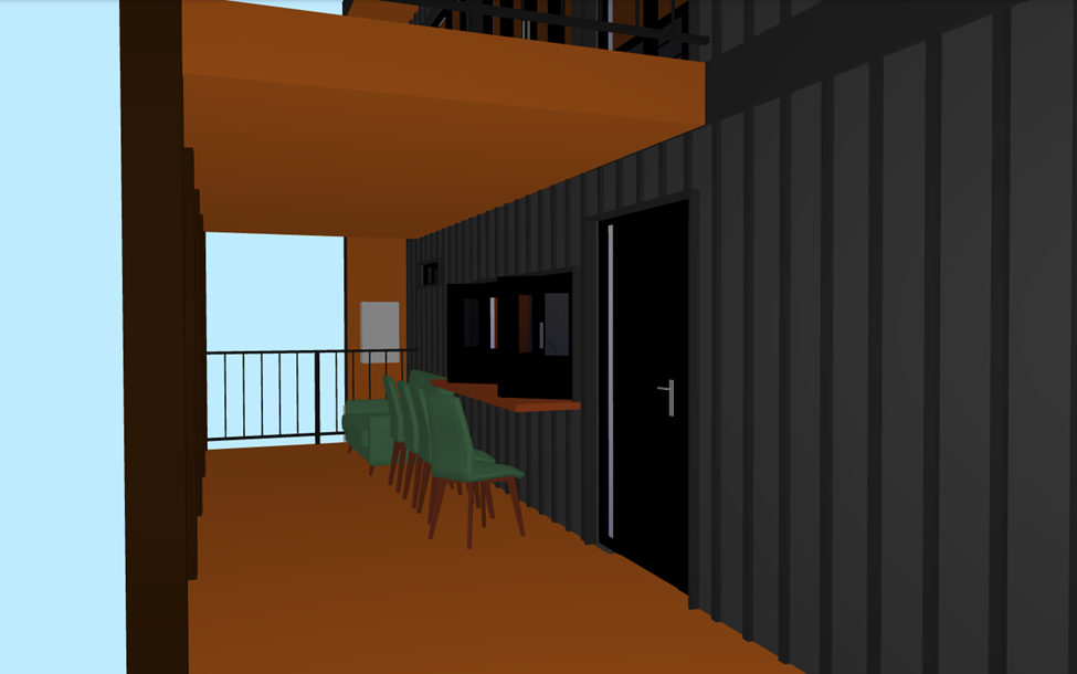 this the outdoor deck area on the first floor of a small modern home there is a 4 piece bi fold window between the kitchen and the deck with a small bar and high top tables the main door to the home is a solid black wooden door in the background there is an exterior tankless hot water heater on the rear exterior wall the exterior of the home is in black board and batten vertical siding and the deck boards and ceiling boards are a dark colored walnut beyond the deck should be spruce and pine trees with golden hour lighting