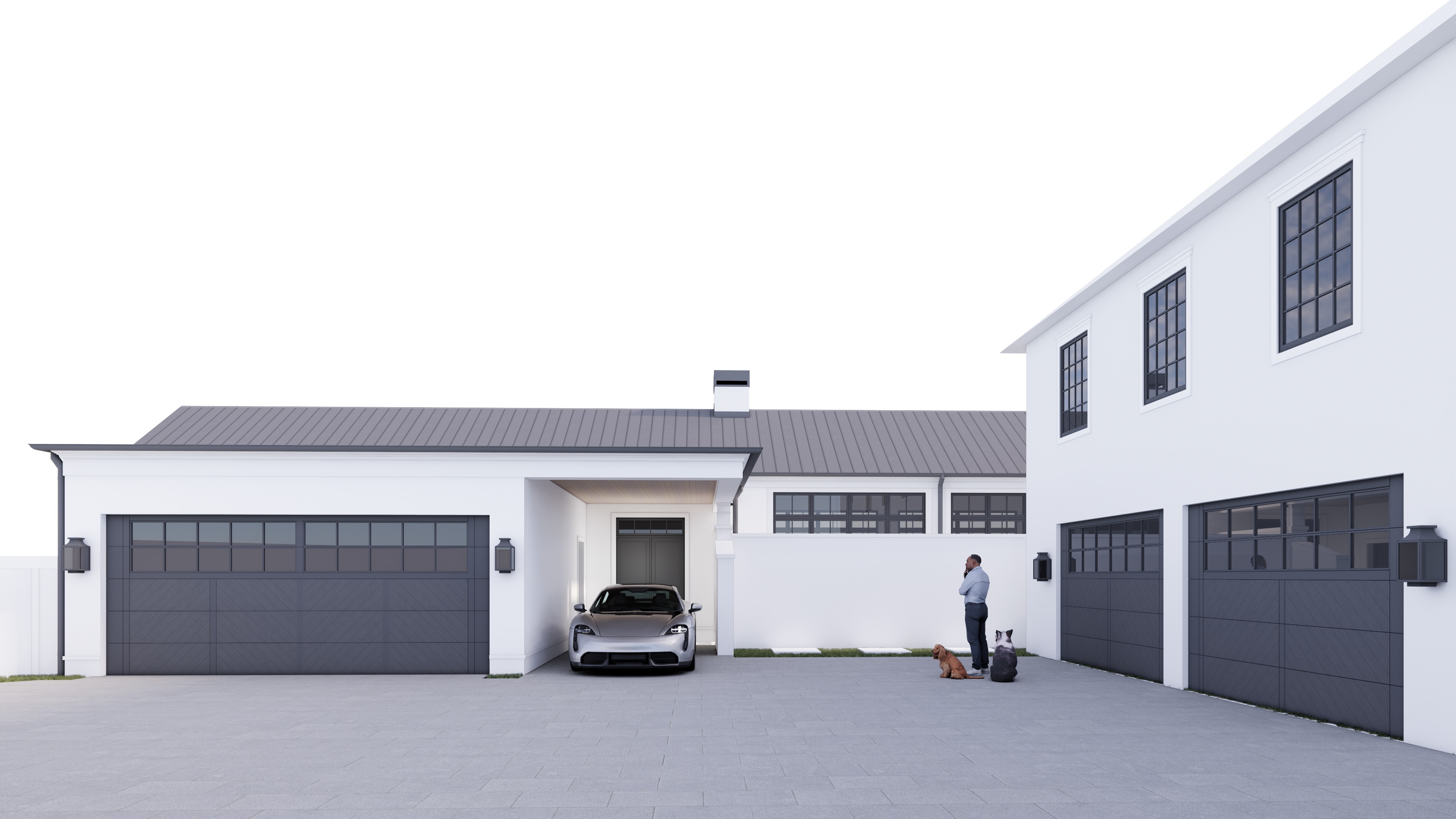 enhance materals add creeping vine around the left garage door add trees on the background and make scene look realistic keeping colors and tones like image