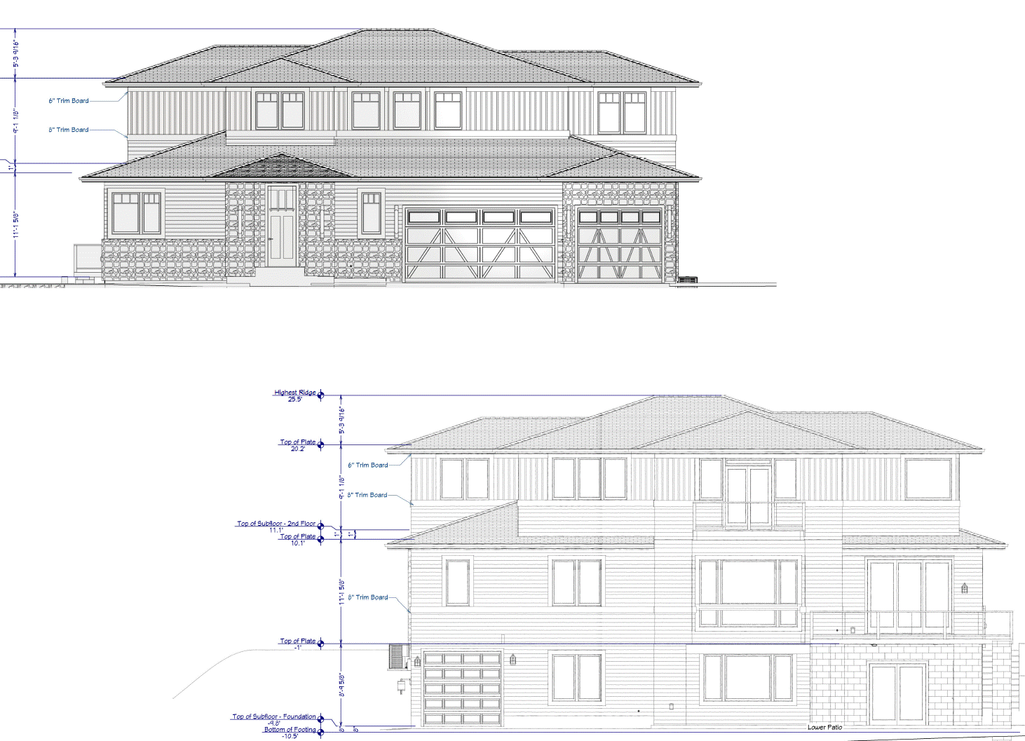 make a realistic 3d elevation of this home on a wooded lot have it be a sunny day lot slopes down to the rear of the home siding is old dublin color batten is natural almond fascia is rubbed bronze