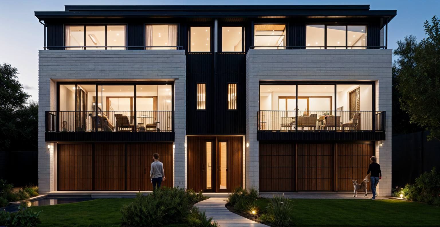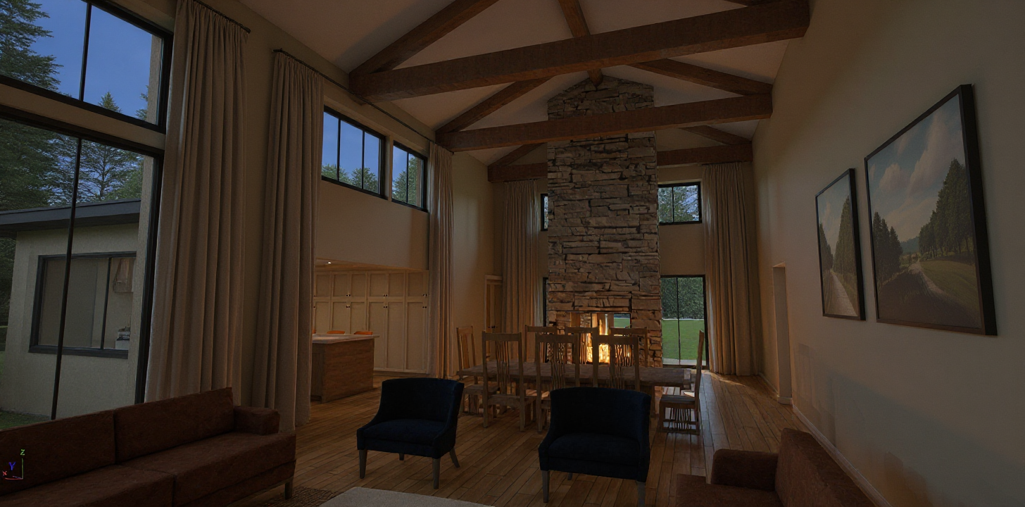 interior of a transitional home tall great room keep exact architectural details sunlight through the windows muted neutral colors black windows fire in the fireplace art on the walls
