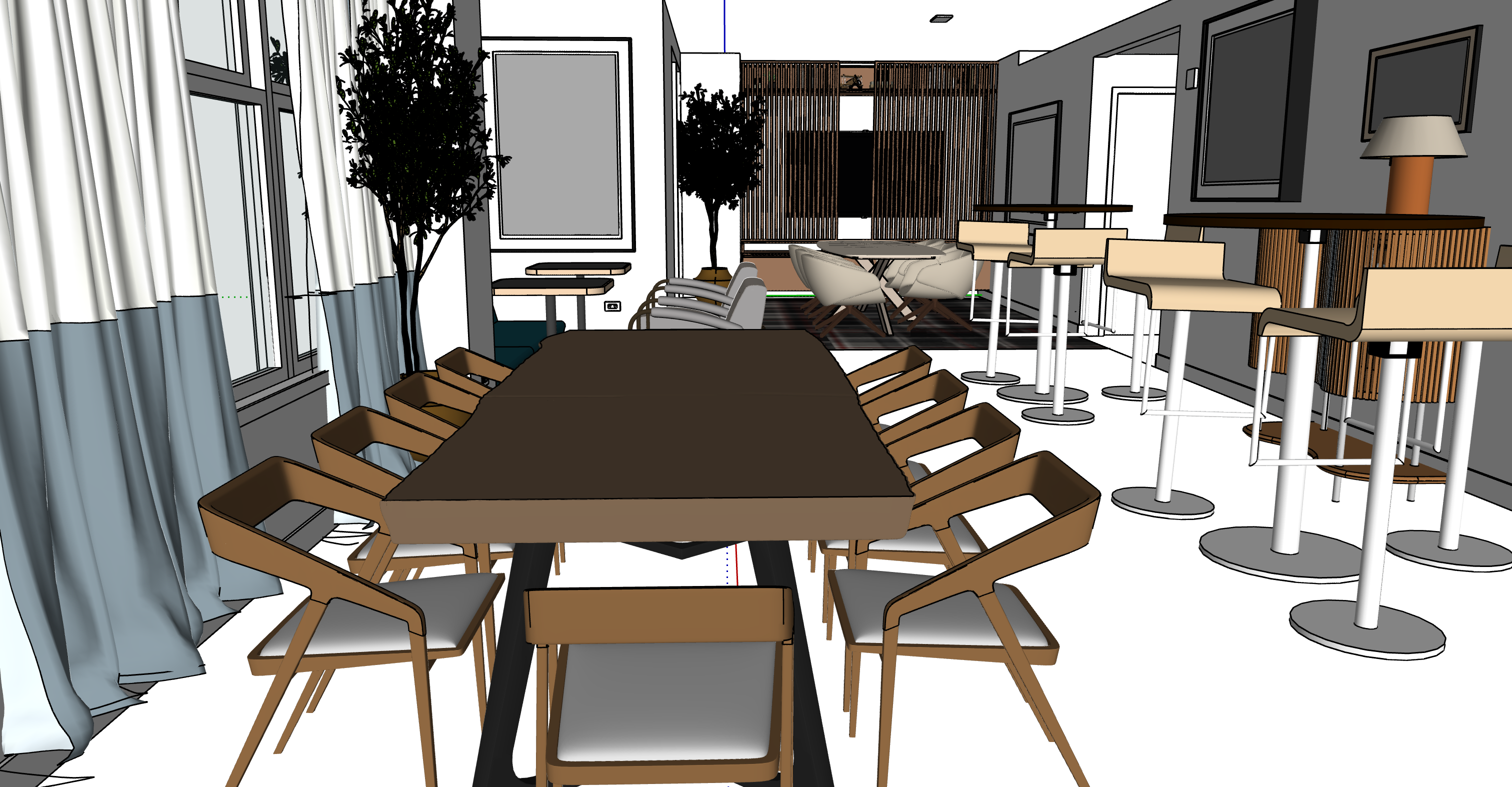 create a hyper realistic photoreal architectural rendering of this high rise residential hospitality room captured in warm golden hour light styled as an editorial interior photograph with the relaxed refinement of soho house and the serene material depth of an aman private lounge preserve the exact geometry proportions ceiling height of 9 feet 6 inches furniture placement architectural alignment and camera perspective exactly as designed with no alterations to layout scale or object positioning the coffered 2 foot by 2 foot ceiling grid must remain intact with oak toned grid lines expressing subtle wood grain and soft shadow reveals the right feature wall is a sculptural parametric acoustic installation composed of vertically mounted pet felt fins articulated in a rhythmic undulating wave formation reading as dense matte architectural felt with refined fiber texture and dimensional depth all remaining walls are drenched in a warm limestone beige plaster finish with mineral movement soft tonal variation and light grazing that enhances the hand applied character rather than appearing flat or painted the flooring transition must remain precise with the conference zone defined by a silver creek carpet tartan in black and white 80 percent wool and 20 percent nylon reading plush and tactile with visible fiber depth and subtle compression under furniture seamlessly transitioning into herringbone oak flooring with natural grain continuity and a low satin sheen extending toward the bar and dining areas furnishings must communicate uncompromising luxury craftsmanship at a holly hunt and italian atelier level with the oak conference table showcasing precise joinery and sculptural linear legs surrounded by beige italian full grain leather chairs with architectural silhouettes visible stitching and natural leather creasing the royal blue tufted banquette on the left should feel richly upholstered with dimensional tufting and saturated depth paired with contemporary round wood bistro tables on matte black cylindrical bases the two lounge chairs must feature brushed brass framing with plush burnt orange tactile upholstery that absorbs light softly bar stools should maintain their sculptural t back profile with matte black and brass bases and neutral brown velour upholstery exhibiting a refined matte plush texture complemented by high top oak tables with matching mixed metal bases the dining table is a 3 centimeter belvedere quartzite slab with dramatic veining polished luster and mineral crystallization depth surrounded by oak dining chairs with clean linear contemporary structure and visible craftsmanship the television remains precisely positioned behind the oak slat divider without altering spacing or alignment subtly visible through the slats and illuminated with integrated 2700 kelvin warm led backlighting concealed within the shelving creating a refined ambient glow architectural linear wall sconces inspired by the kelly wearstler collection for visual comfort emit warm 2700 kelvin light that grazes the plaster walls while three sculptural semi flush ceiling fixtures distribute soft balanced illumination large black olive trees in honed limestone planters add organic height and realism and the windows reveal a faint chicago skyline softly out of focus filtered through golden sunset light with gentle reflections on interior glazing introduce a small number of modern young professional residents casually seated at the bar and select tables properly scaled with natural posture clear facial definition and no anatomical distortion styled in elevated neutral attire that complements the space without obstructing architectural details the final image should feel like a meticulously styled architectural digest spread with ray traced global illumination physically accurate material reflectance micro texture detailing in wood grain and stone polish soft ambient occlusion in architectural corners gentle specular highlights on brass and quartzite subtle lens bloom controlled contrast rich shadow depth and a warm 2700 kelvin golden hour atmosphere that enhances color richness and material authenticity while keeping the entire composition exactly as originally designed