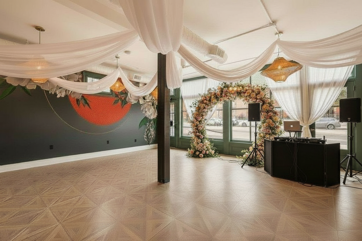 add a neon gold sign to the wall that says forever and always surround the sign with flowers and string lights