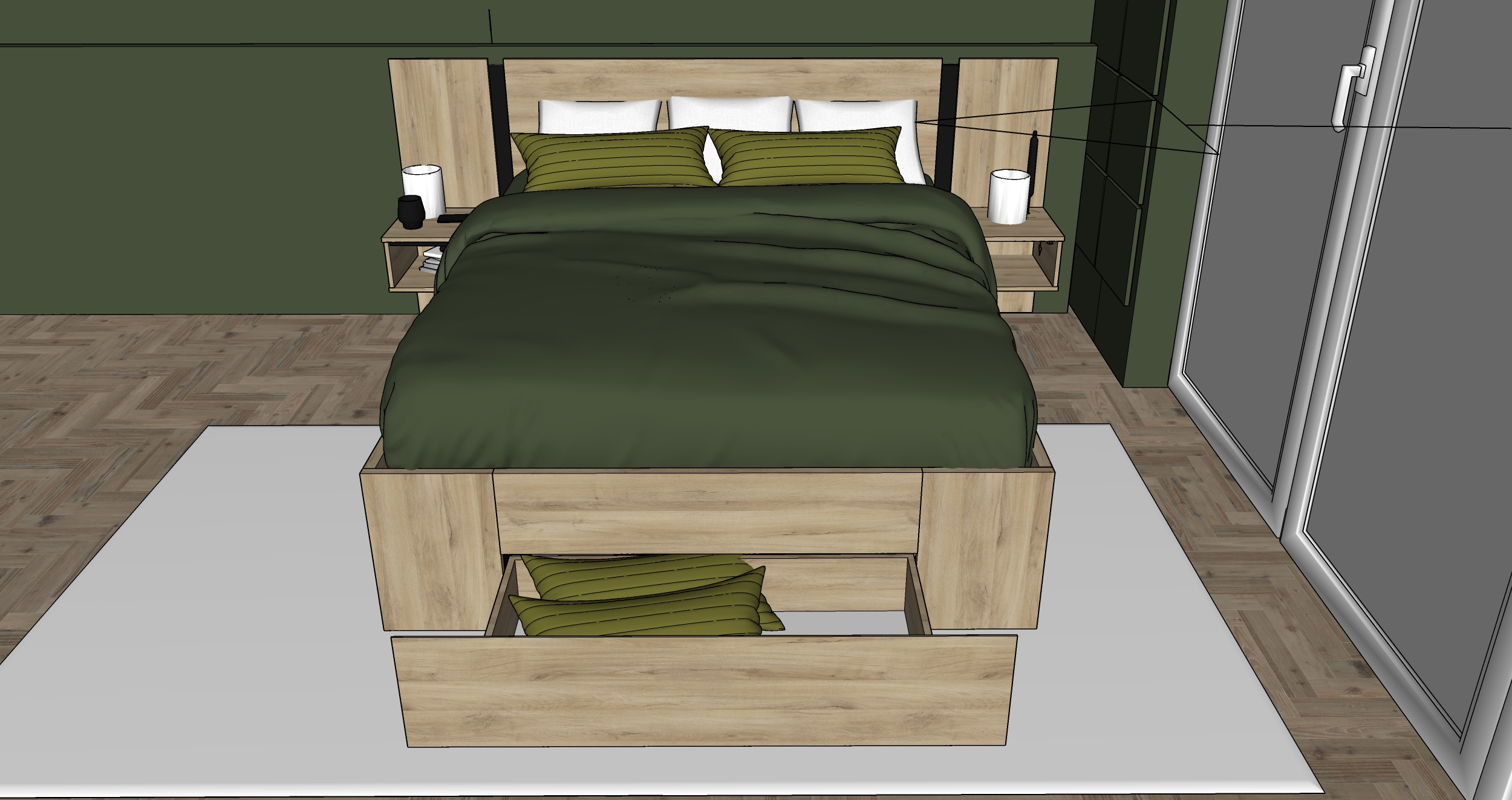 chambre moderne et chaleureuse au design naturel grand lit avec drap beige couvertures vert fonc et coussins assortis mur d coratif vert textur plantes tombantes fix es en hauteur suspensions avec ampoules vintage en verre sol en bois clair grand tapis gris clairage led dans les deux niches de la t te de lit ambiance cosy style contemporain et minimaliste clairage doux et r aliste rendu photor aliste haute r solution