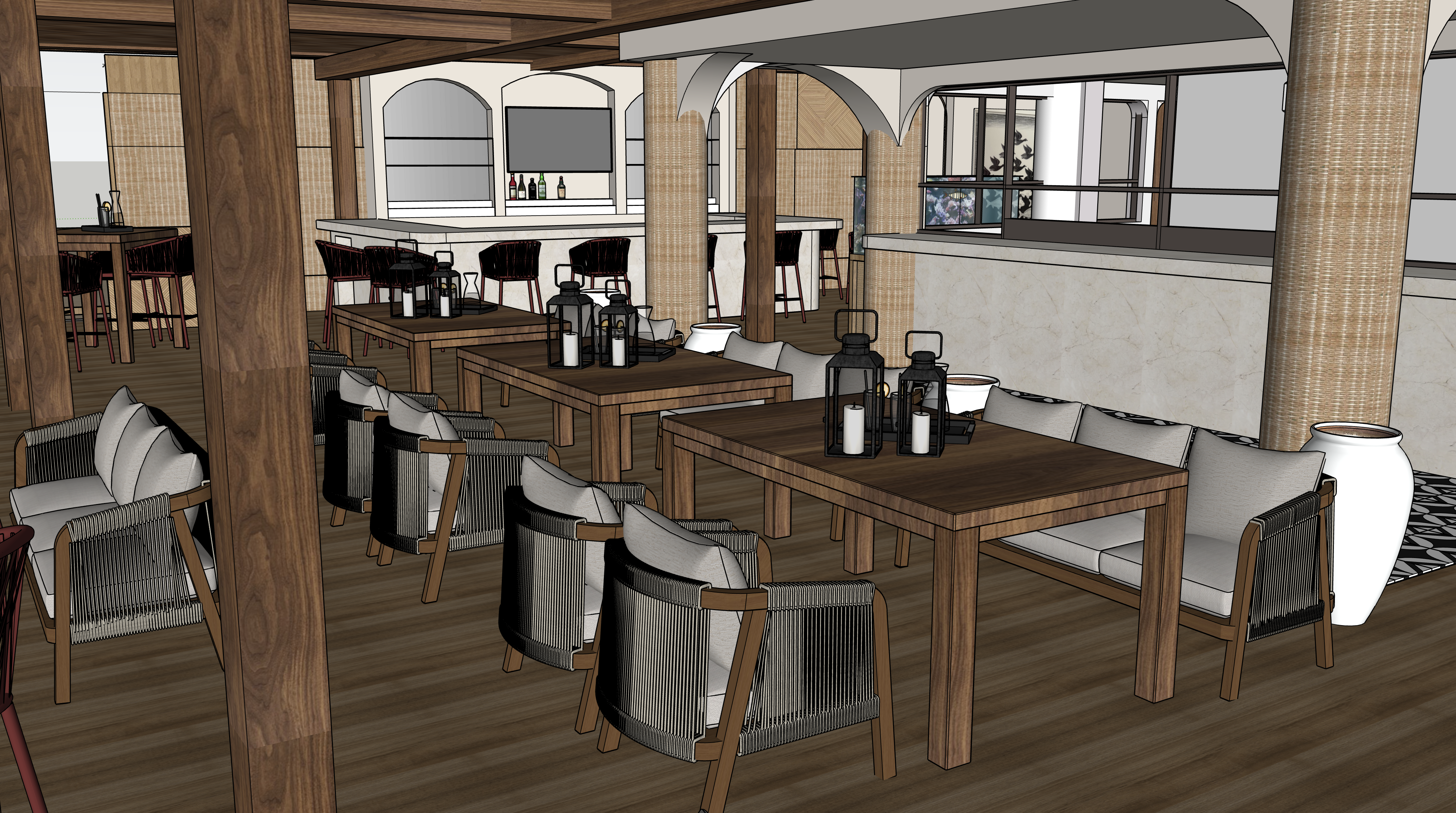beach club restaurant with indirect light in the bar at the background and spot light from the floor lighting the columns light olive taupe upholstery