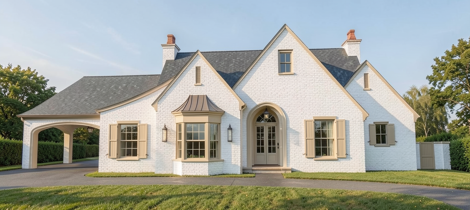 white brick walls with light taupe trim and shutters add landscaping to front of house