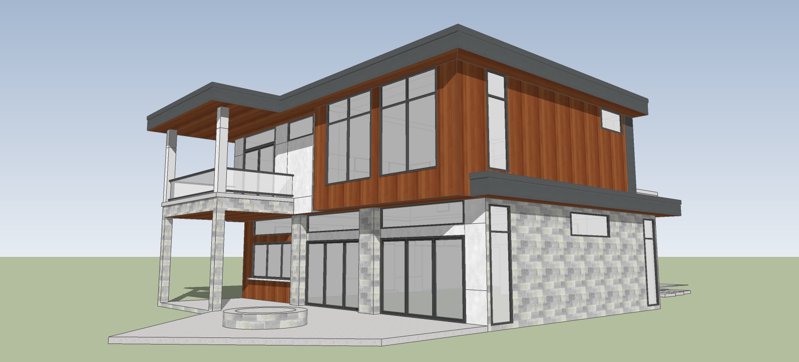 create a photorealistic rendering of this modern house keep the color elements add lush landscaping and a mid day sky with clouds