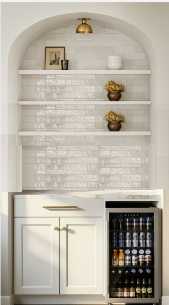 render this to be one image and have bar glasses on the shelving