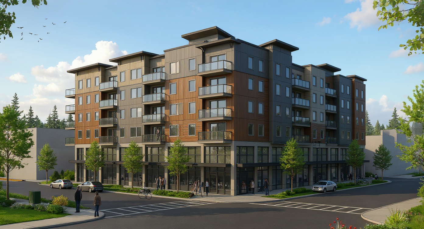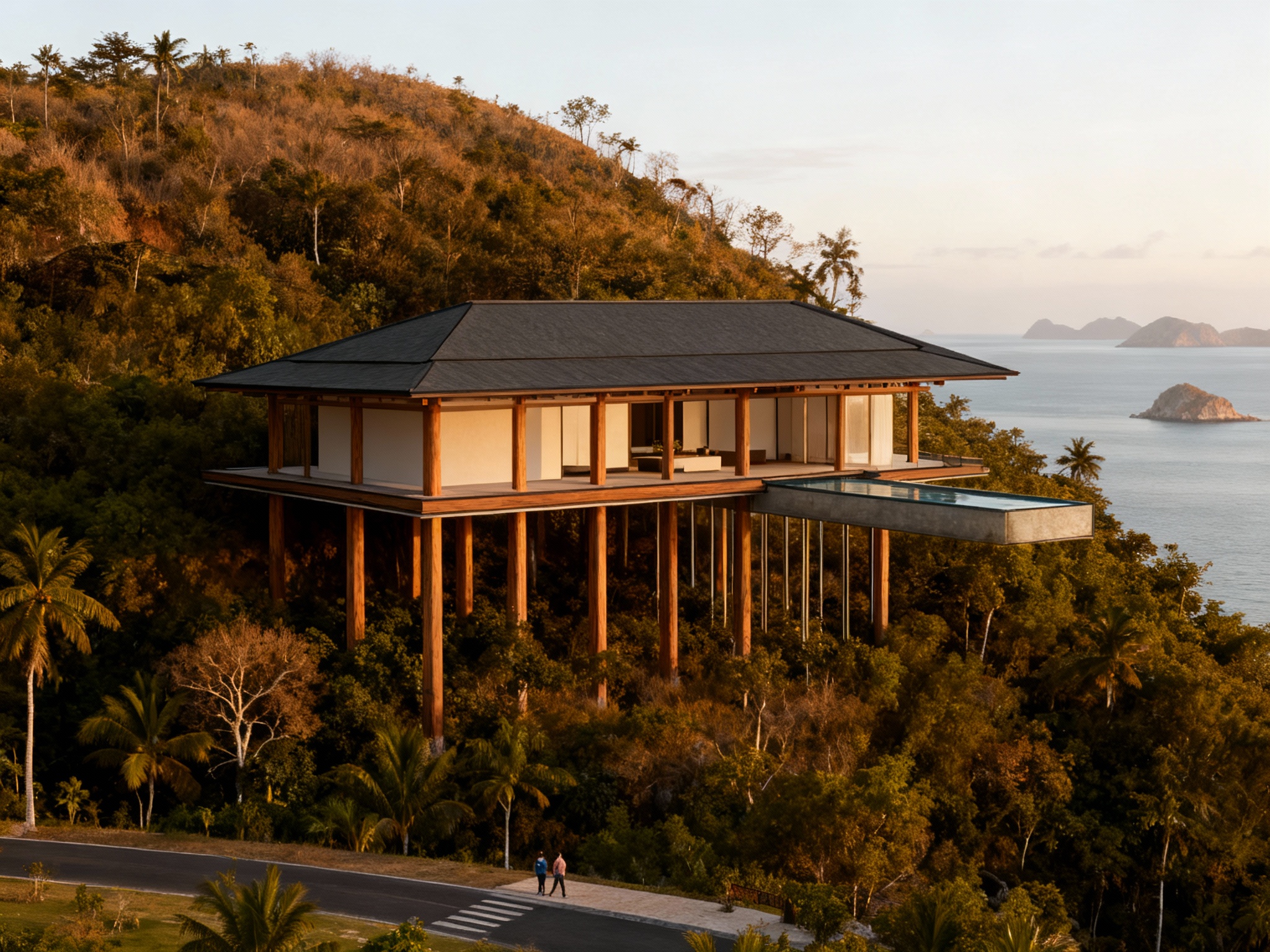 using the exact same angle and composition from the existing raw 3d drawing render the luxury japanese style villa realistically preserve all original proportions and viewpoint enhance the wood columns dark roof and minimalist modern design show the villa on stilt construction appearing to float above the coastal hillside dry forest of labuan bajo maintain the ambience sea visible in the far background small road and pedestrian area in the lower foreground and dense tropical vegetation covering the upper hill behind the building