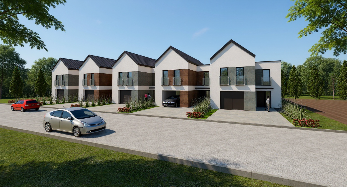 aerial view of a modern architectural complex featuring sleek minimalistic 2 to 3 story buildings flat green roofs and green on balconies facades are smooth white finish ang big glass windows and wood panels replace green for realistic trees grass and flowers around houses the roads and parking areas are a deep charcoal gray dotted with bright white parked cars for contrast the atmosphere is serene and inviting under a soft light cloudy summer sky