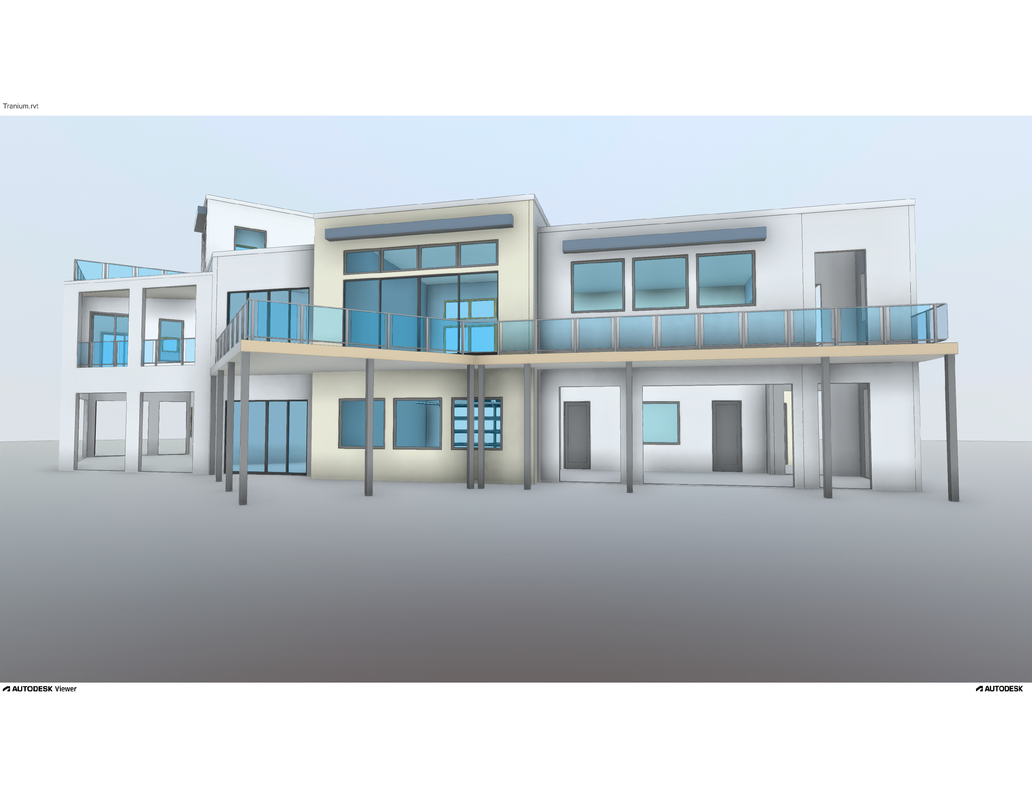 a two story modern house with a flatroof detailed exterior architecture the house features off white walls add black accents on the beams and window frames the porch railings and stairs are painted in a soft gray integrate large clear windows reflecting a serene blue sky create a peaceful sunny atmosphere with soft shadows and a warm inviting ambiance around the building the background should suggest an open calm landscape