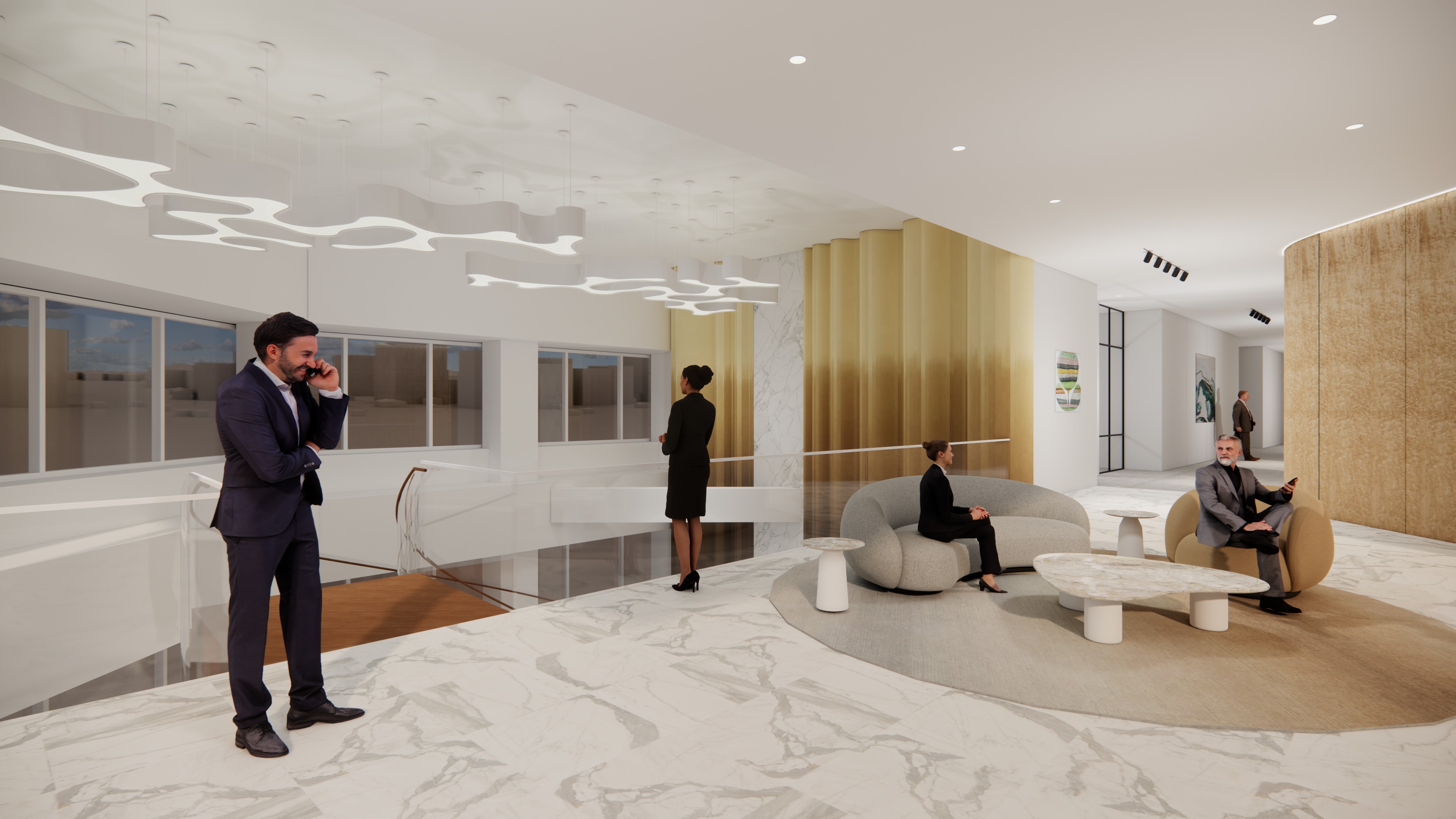 transform the provided interior image into a high end photorealistic render with soft glowing highlights and relaxed upscale energy while keeping everything exactly the same same proportions same seating same ceiling same wall finishes same materials and same spatial configuration do not move or alter any objects geometry textures colors or furniture positions all objects throughout must remain exactly in the same locations and proportions on the left windows only provide nyc building views from 44th floor in the middle of midtown new york city in the morning cool light do not change people