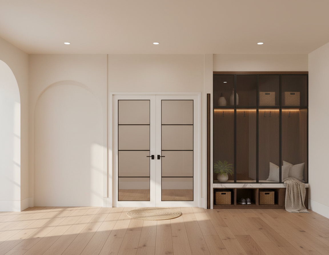 mountain modern ski home warm light emanating from the windows wood ceiling vertical siding in weathered wood brown areas and horizontal siding in black areas snowy pine forest around the home and distant low mountains alpine glow from behind the camera party on the deck