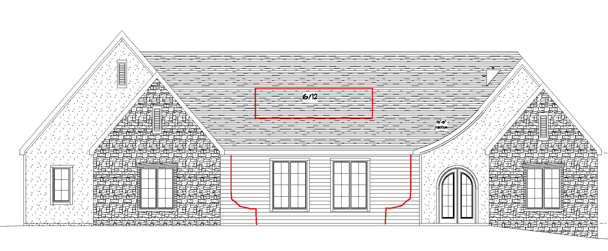 black roof white siding white brick and white stucco black windows black soffit and fascia make roof over two big center windows a covered porch keep everything else exactly like you just rendered make the roof black shingles not metal no siding on the front elevation and do not add an another gable or arch window keep everything except make arch roof a gable end if you have a question on something ask me do not assume and just add something