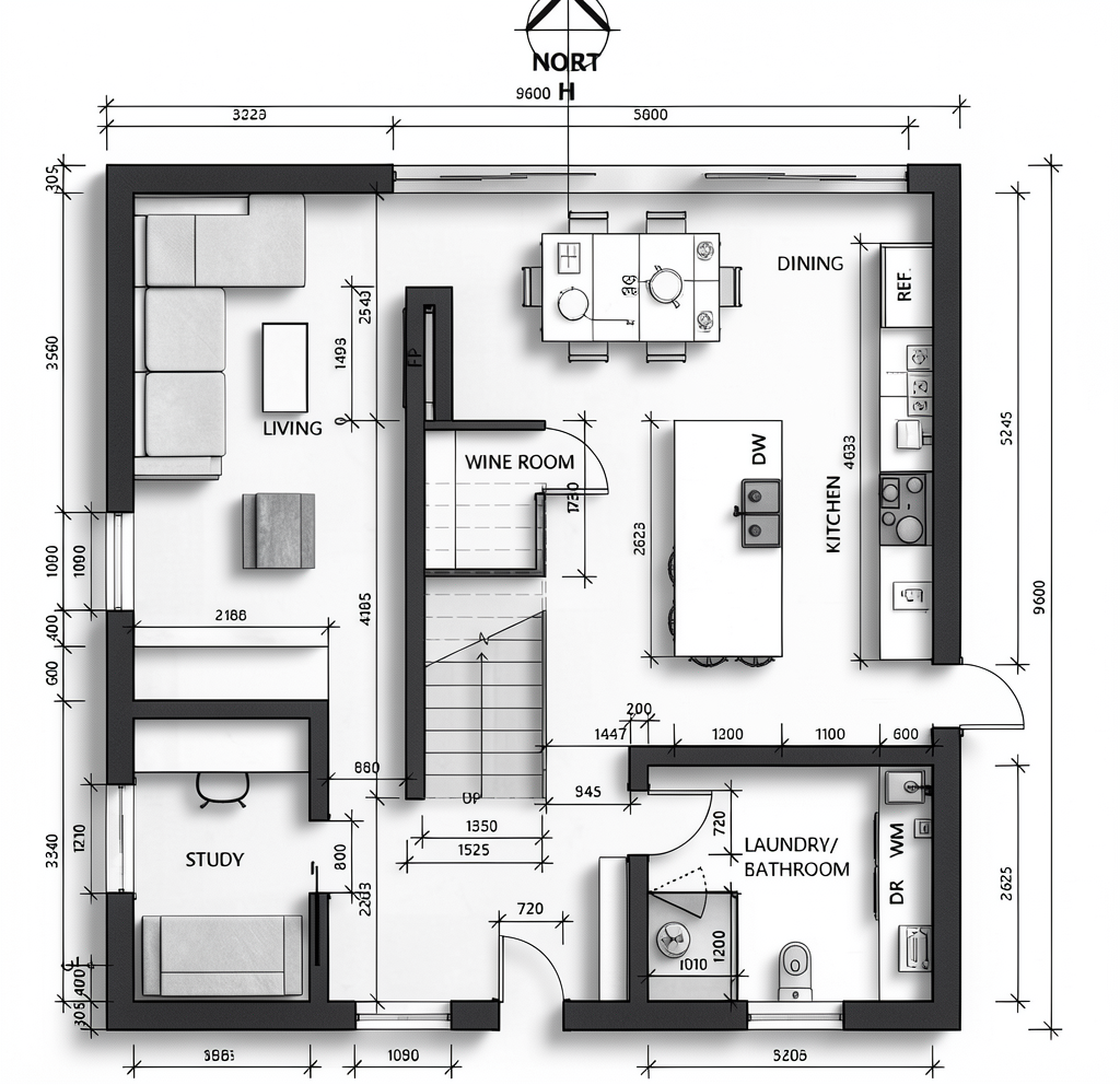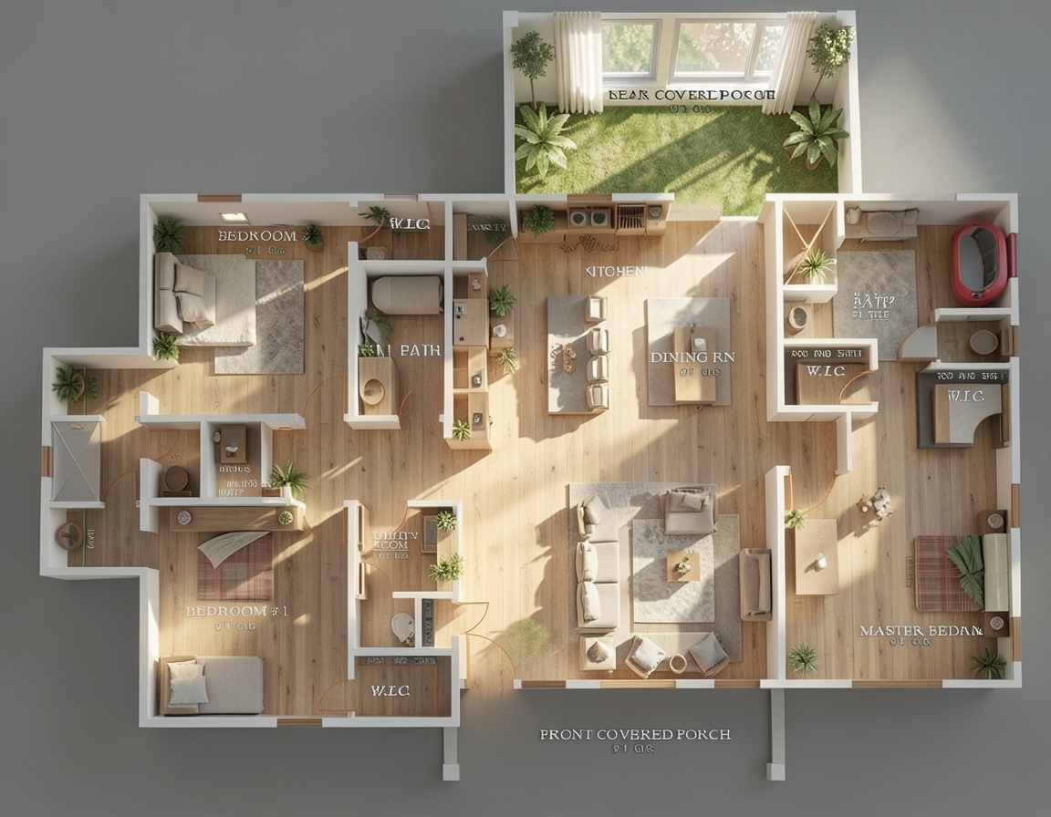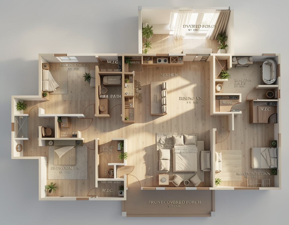 hyper realistic render this floorplan like 3d plan make wall pop up soft sun light visible from window add concret slab at rear covered porch