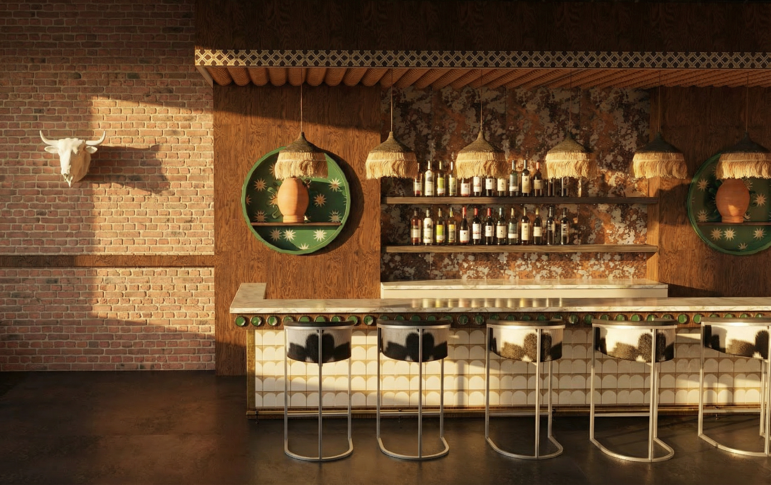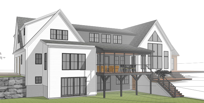 modernist exterior shot make realistic modern farmhouse with grass lawn and retaining wall along the deck stairs architecture