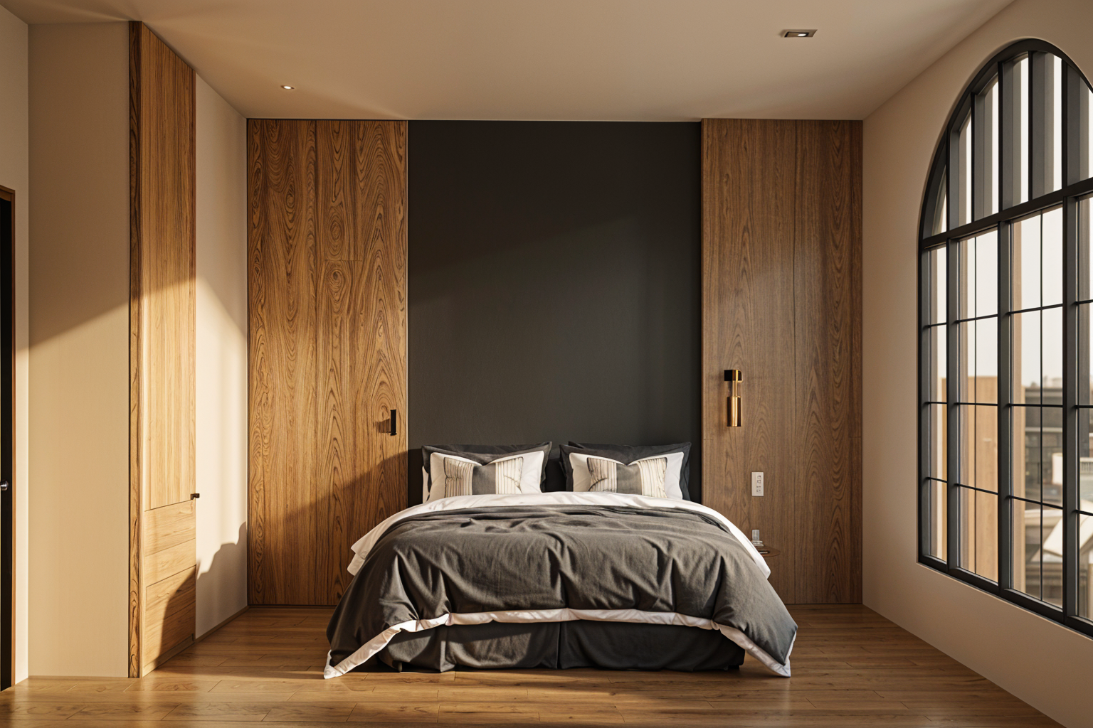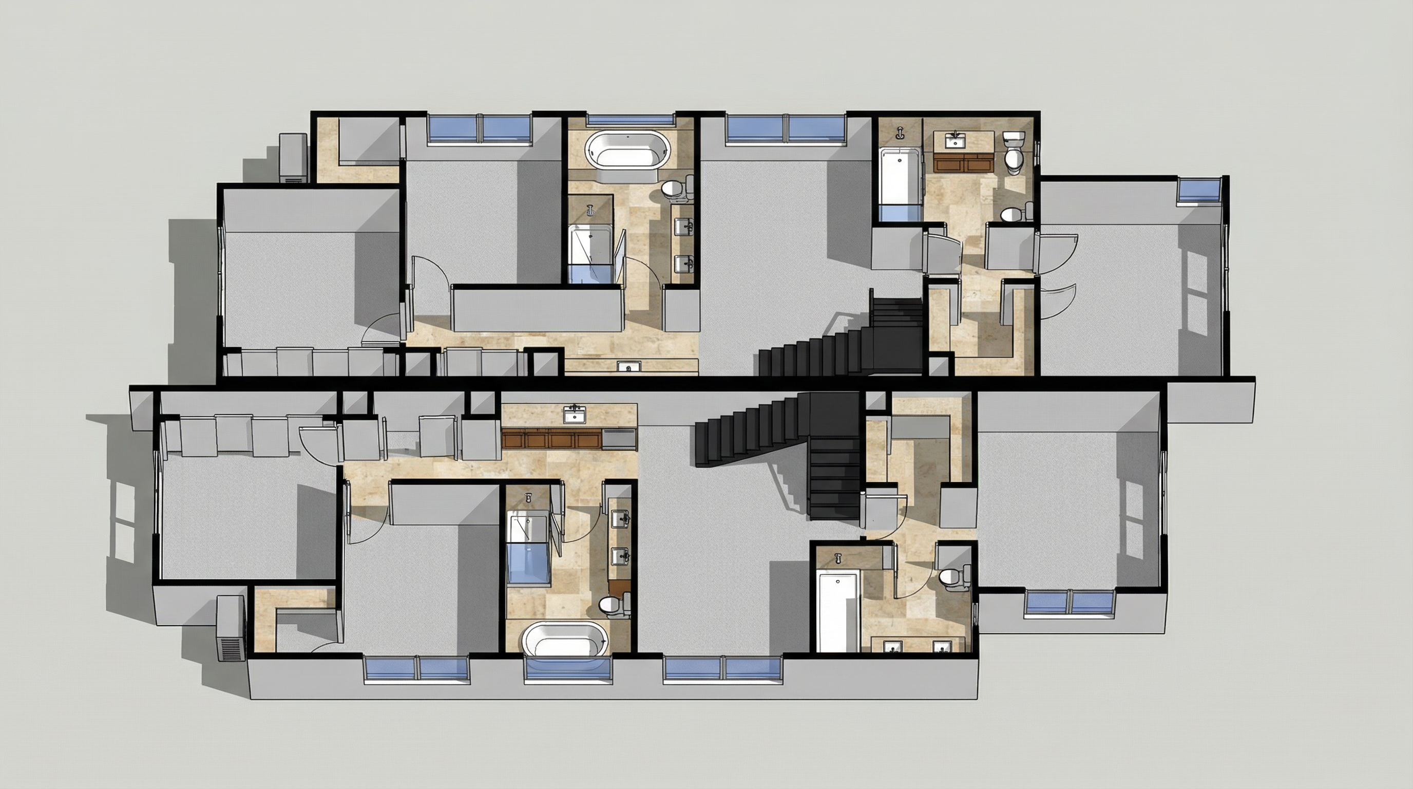 add subtle ceiling skirting cornices around the top of the walls add a staircase leading down in the small wall opening on the left side of the hallway keep the staircase aligned with the existing walls and make it look built in use the exact same dark striped carpet material on the stairs as the hallway floor do not change any other walls doors materials or lighting