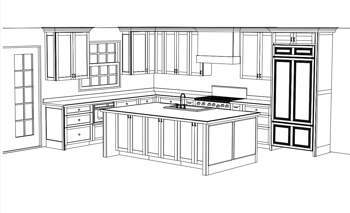 white inset cabinets with blue center isladn
