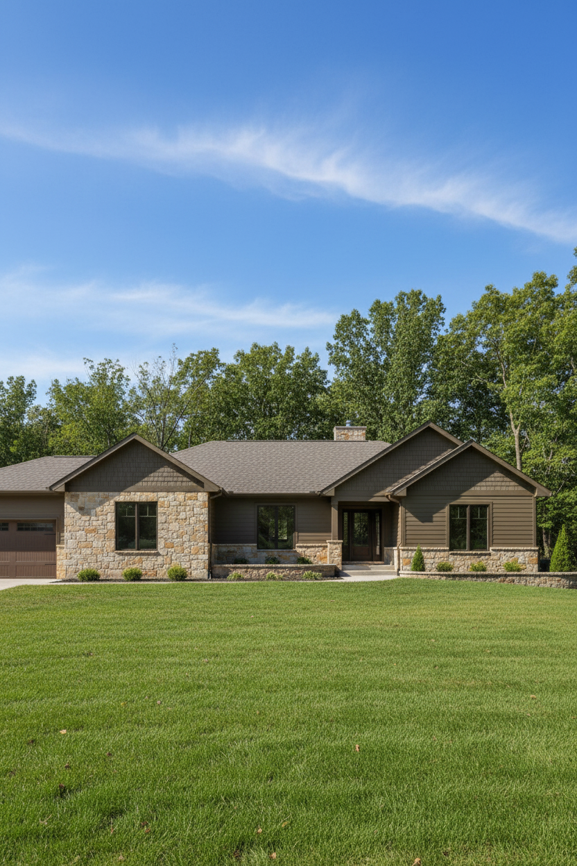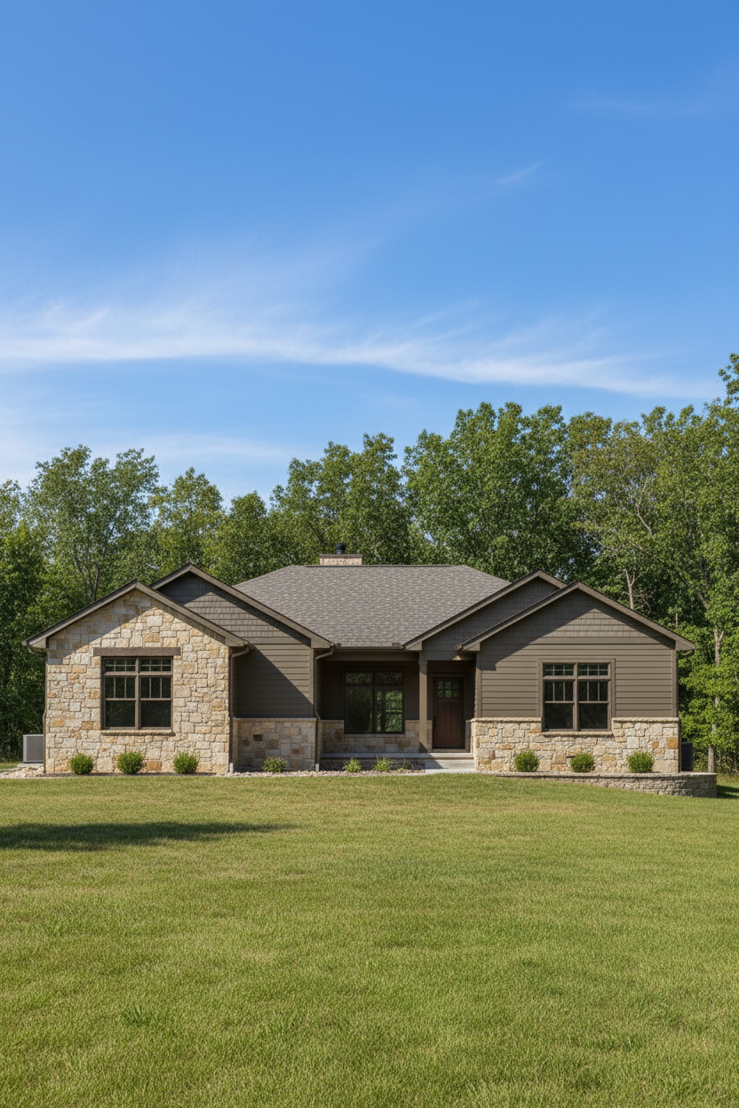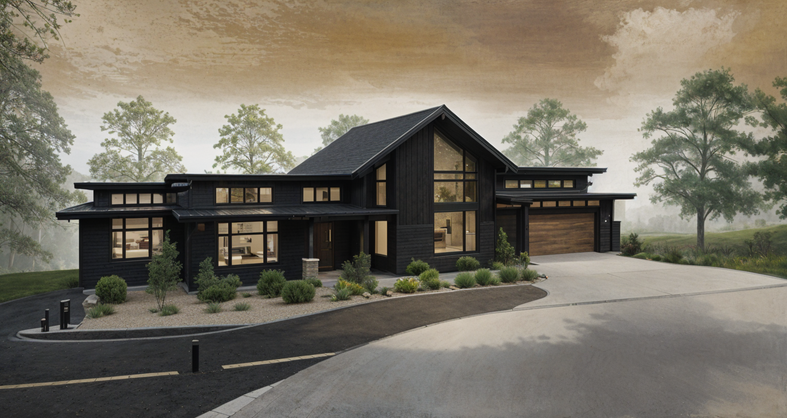 grainy watercolor rendering of house with black and medium tone warm wood siding surrounded by oak tree forest and leafy forrest floor dense forest background asphalt driveway where indicated architecture