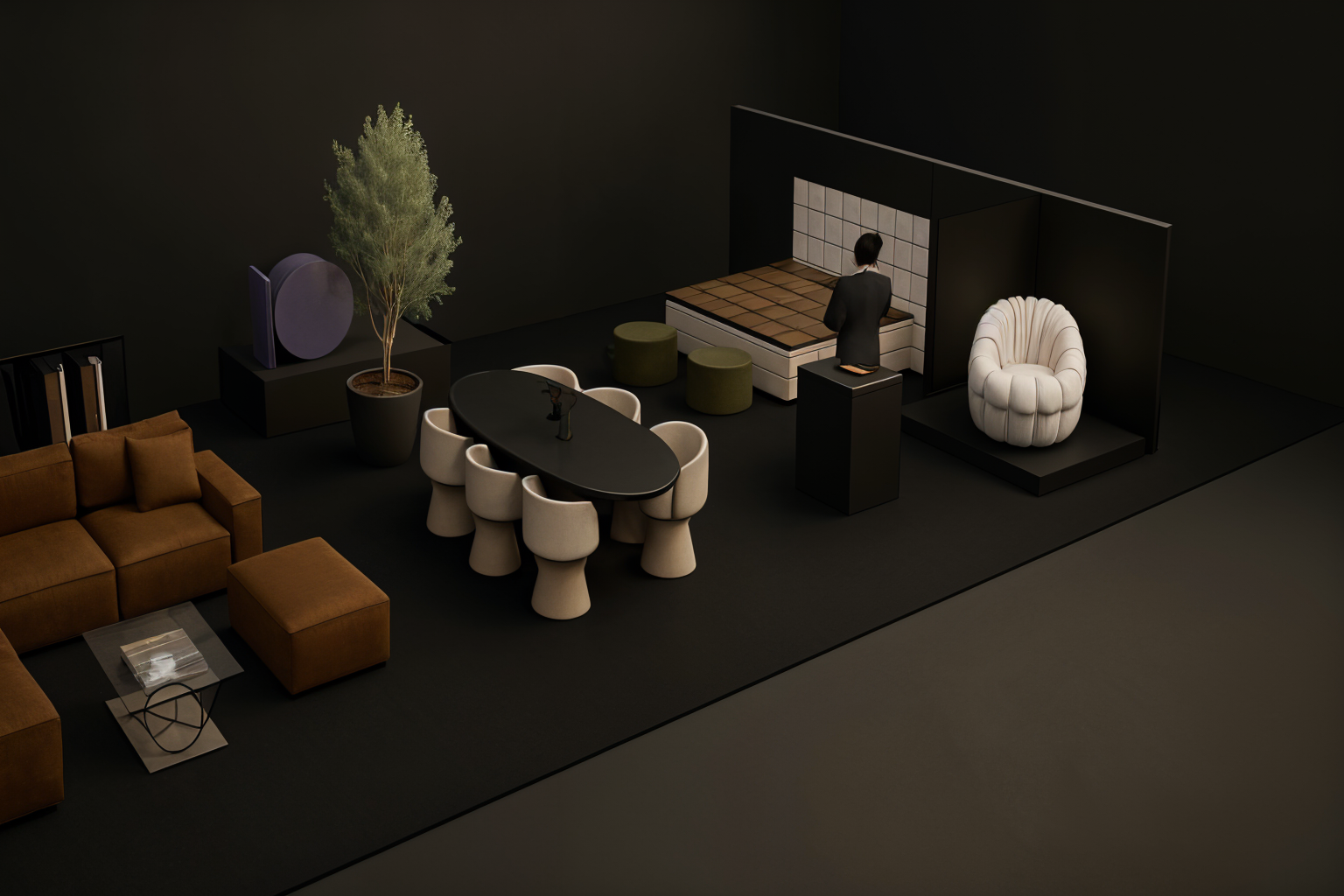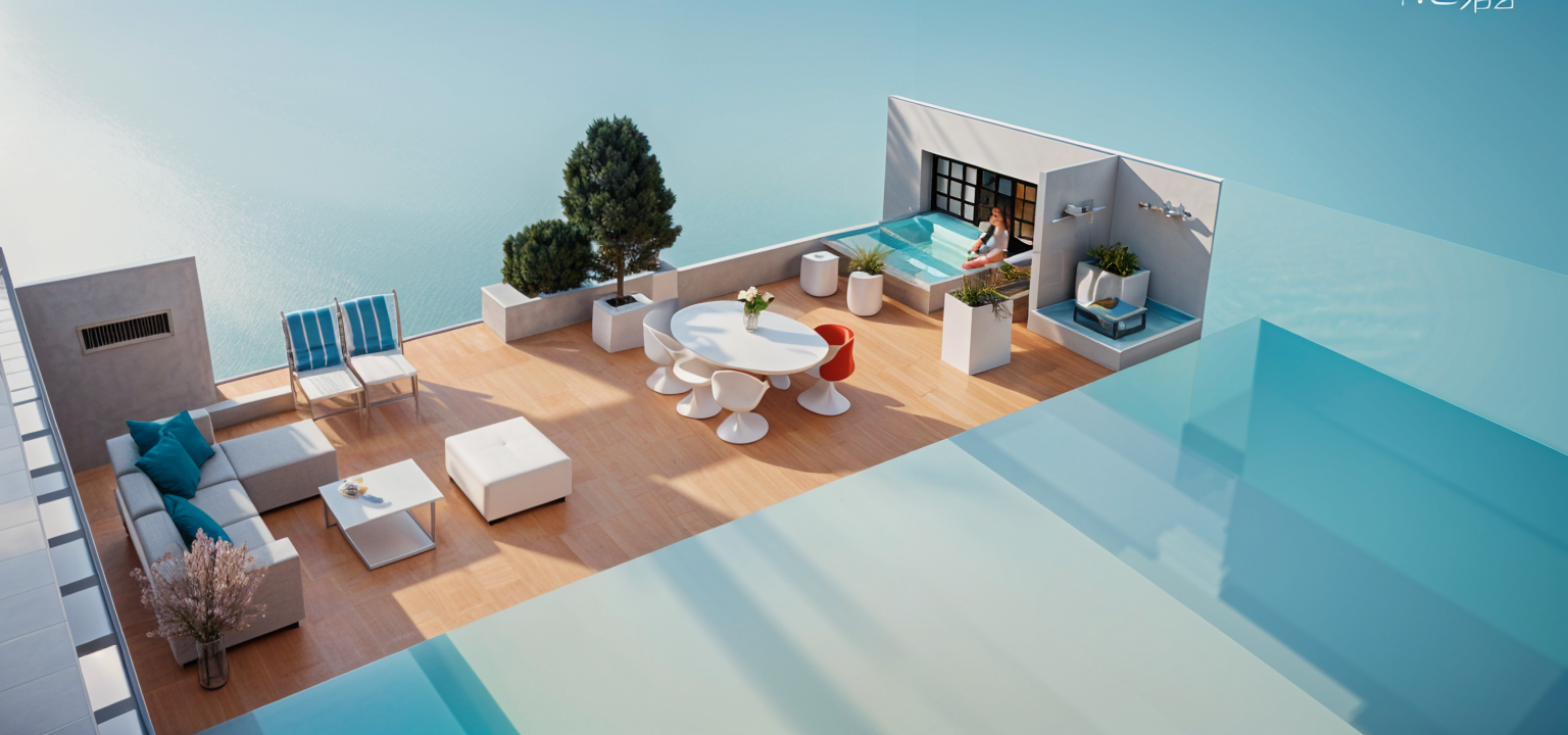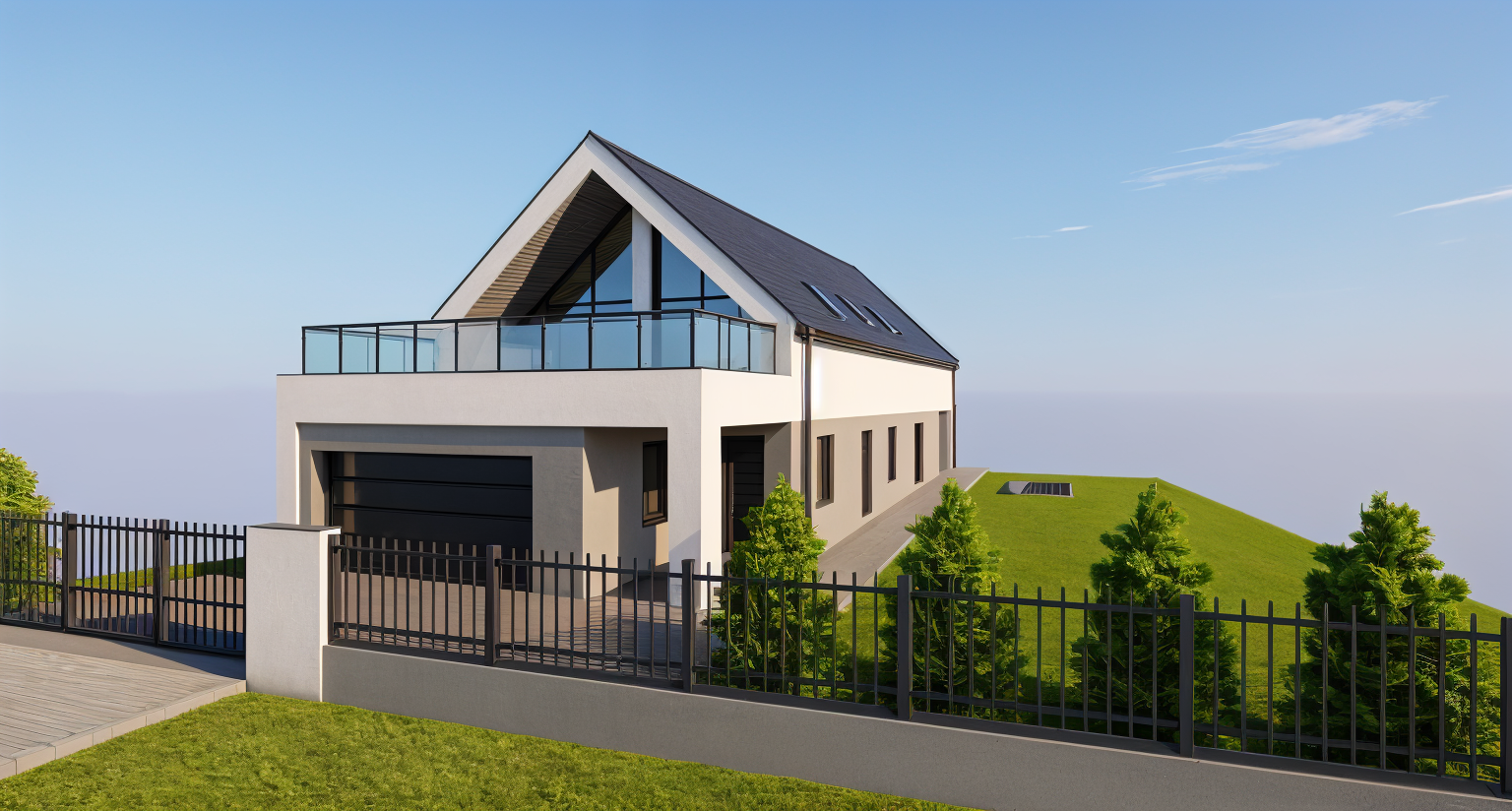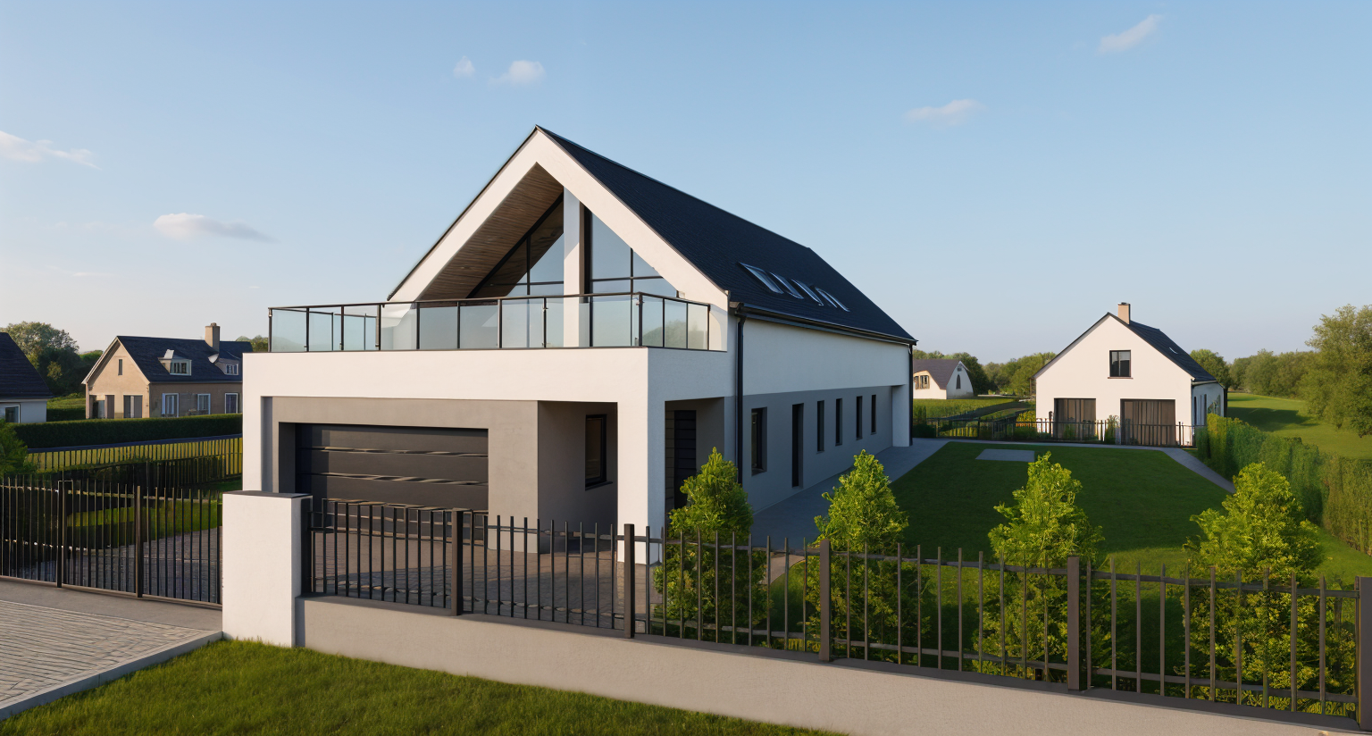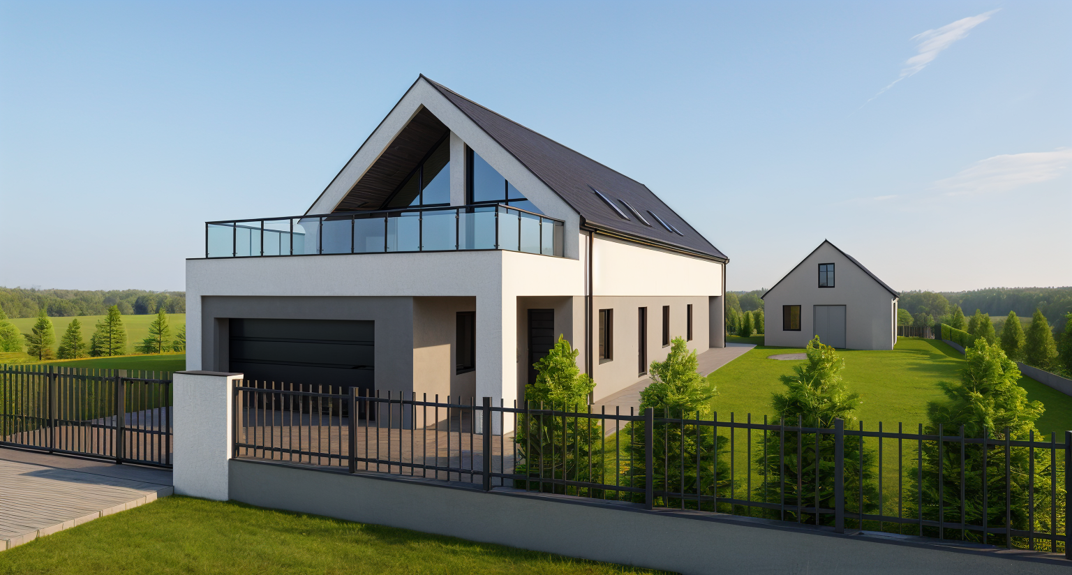 a modern minimalist house with a triangular roof and large windows the walls are painted in smooth white with sleek gray accents the roof is a dark slate gray contrasting with the light facade the surrounding landscape features lush green grass and neatly trimmed bushes the outdoor area includes a clear blue swimming pool bordered with textured gray tiles the sky is a calming pastel lavender casting a serene and tranquil atmosphere over the scene
