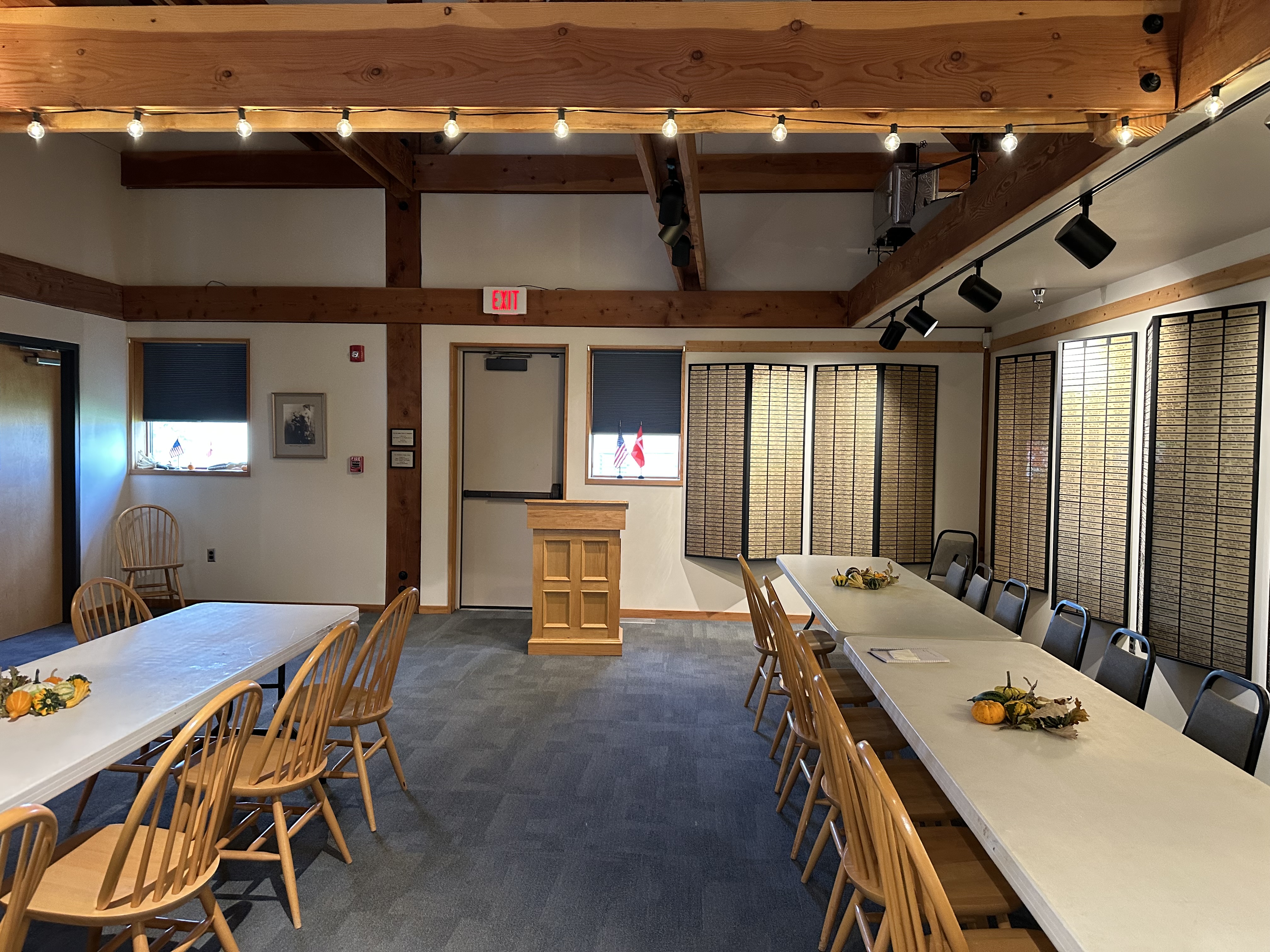 keep wood beams and columns remove tables and chairs all walls become glass and views out the windows shall be prairie show a ford model a sedan inside building set up as an exhibition in right corner of room