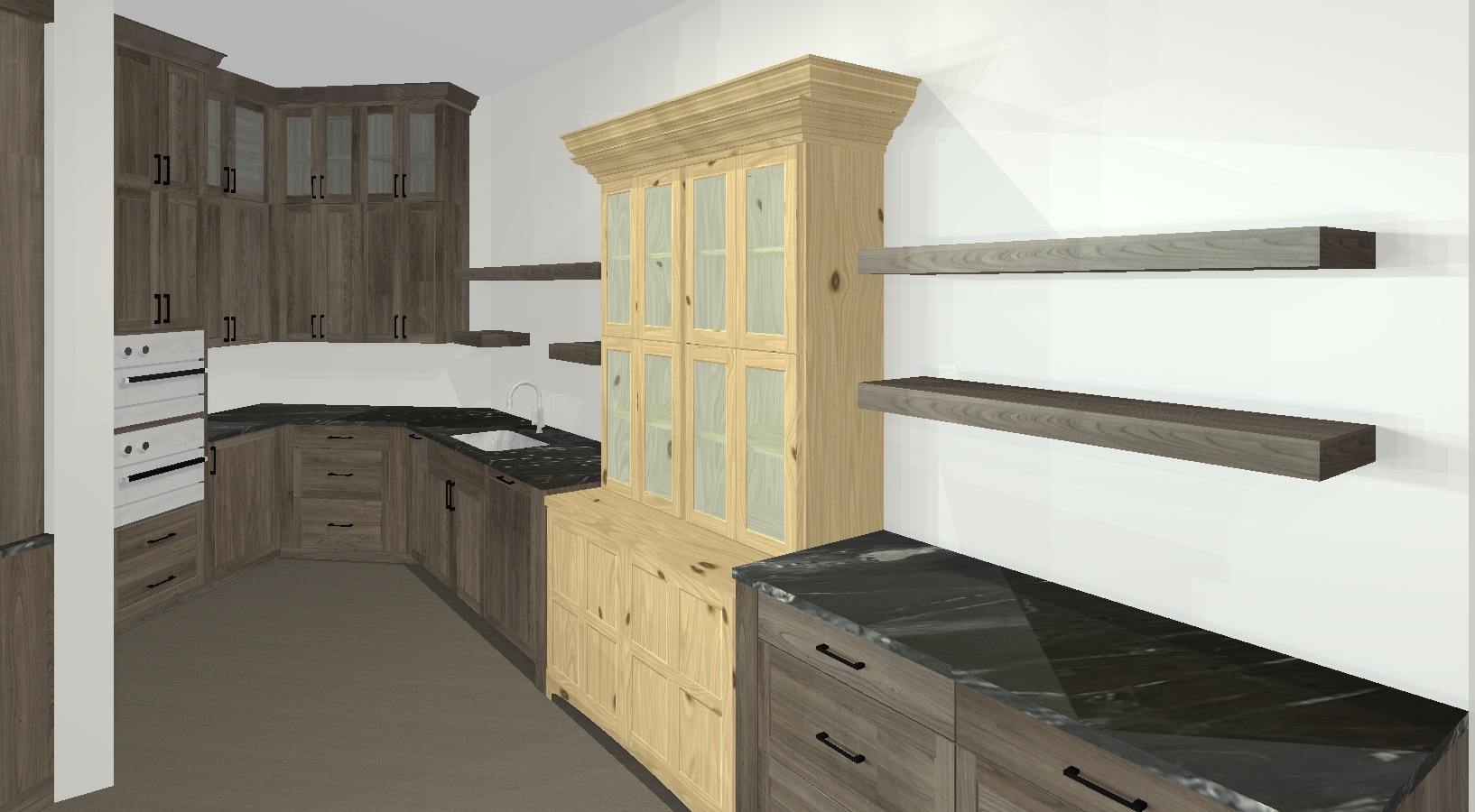 make light hutch look like an antique with a dark interior with lighting rest of cabinetry is finished in a charcoal paint with led lighting in cabinets and under cabinets countertops are a dark granite overs are stainless steel walls are a medium grey backsplash is a fancy tile